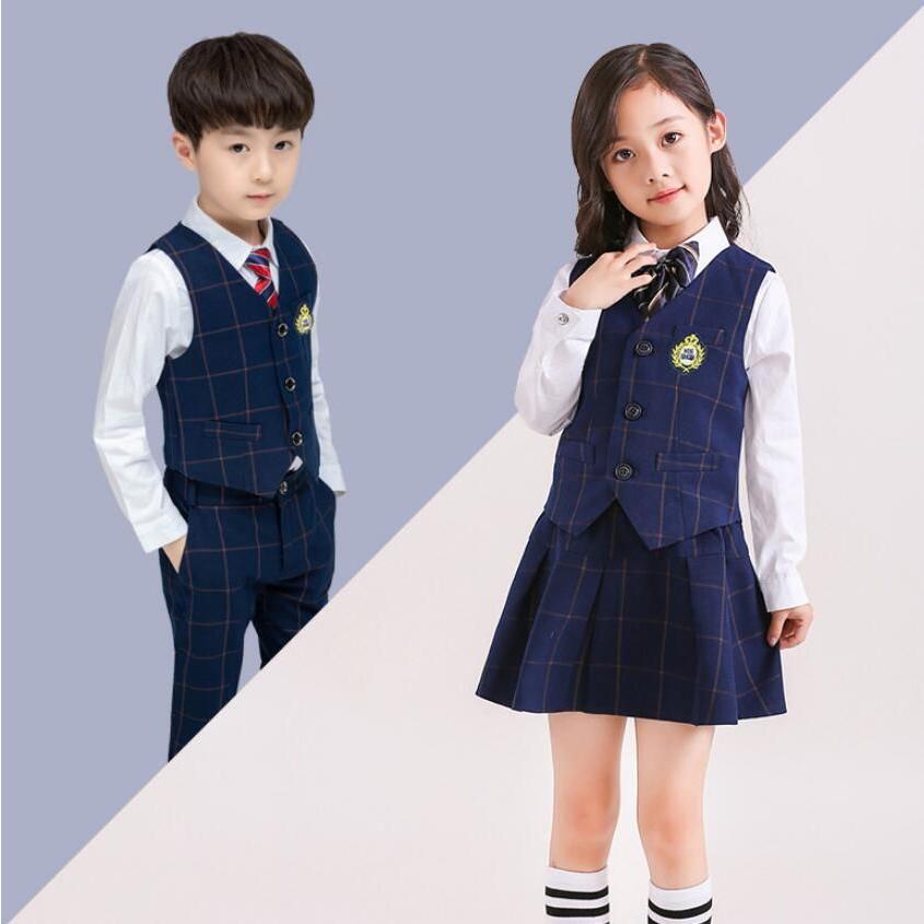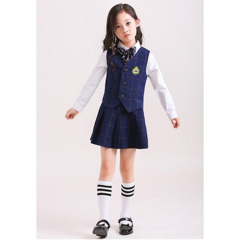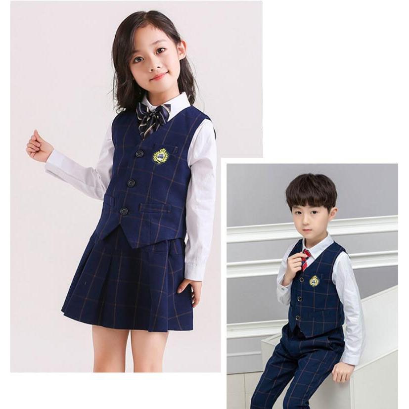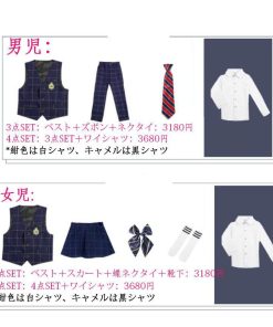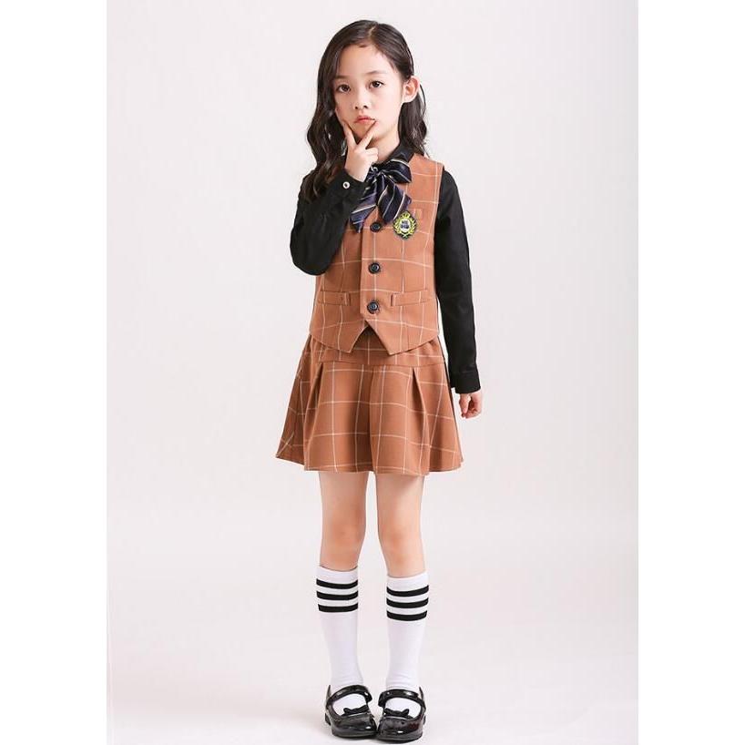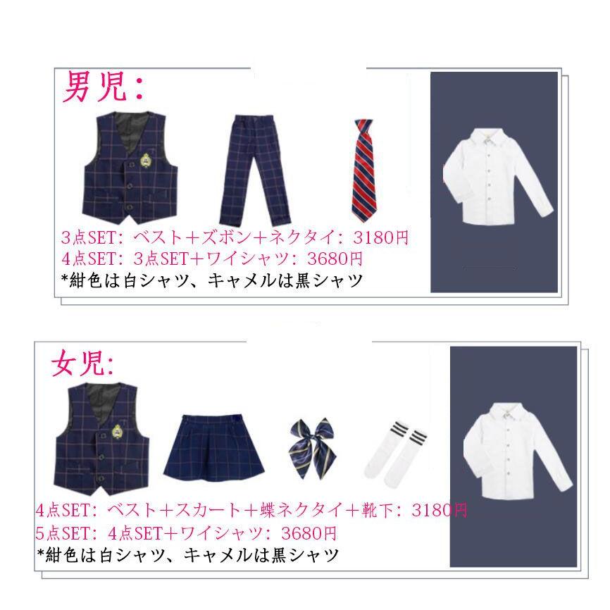 「即納」子供服 制服 スーツ セットアップ キッズ チャック柄 スーツ3点セット ジレベスト 長ズボン 膝丈スカート ワイシャツ (蝶)ネクタイ 学院ユニフォーム