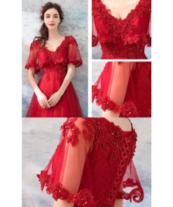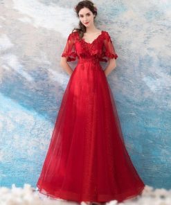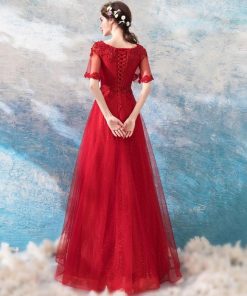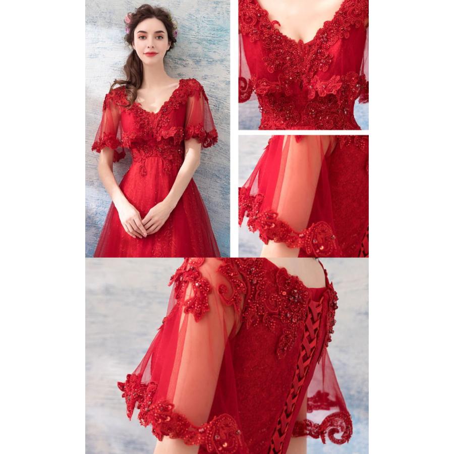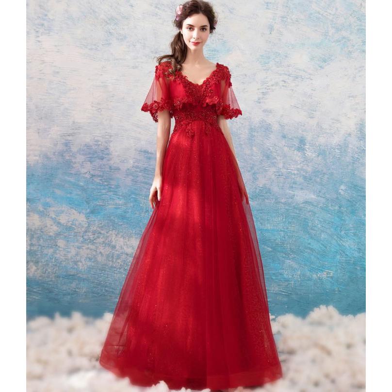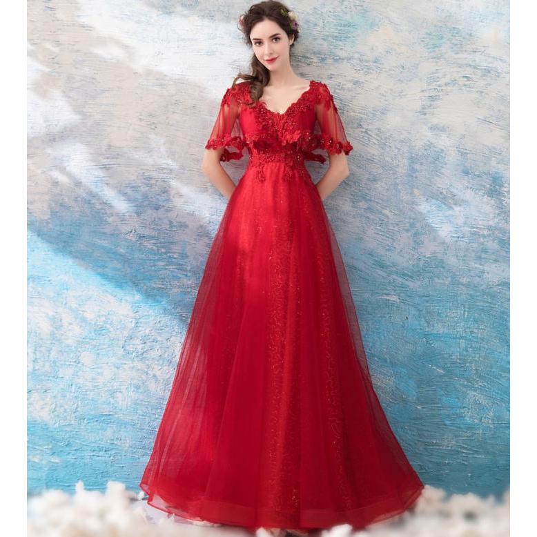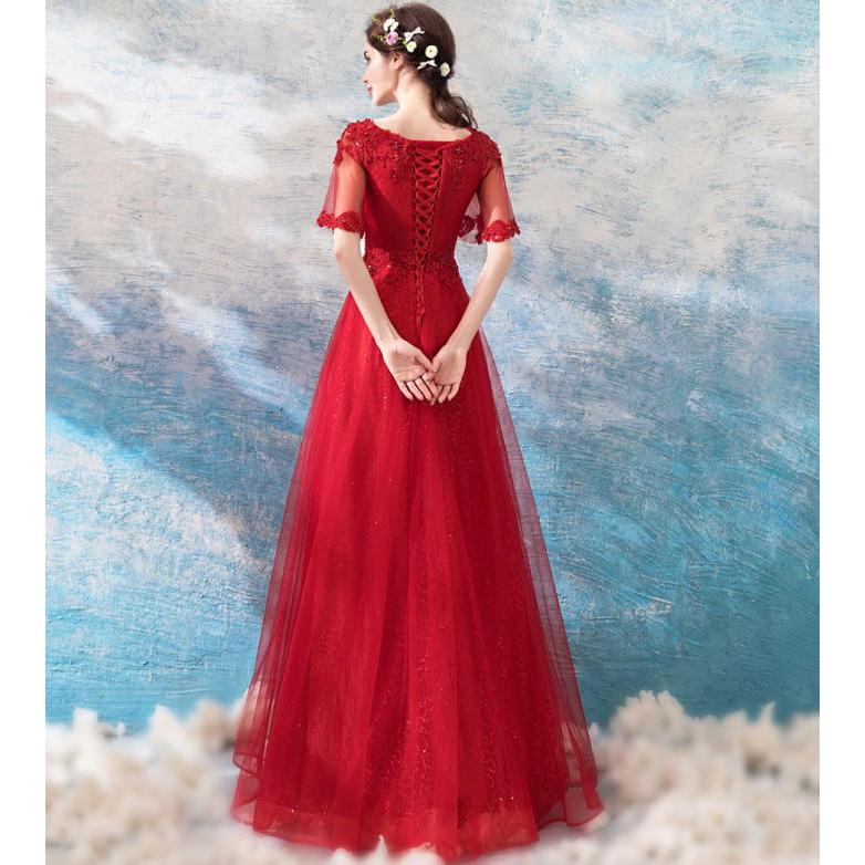 【ANGEL】肌透けチュールスパンコールビーズ半袖付き背中編上げAラインロングドレス【送料無料】高品質 レッド 赤 ロングドレス パーティードレス【G