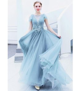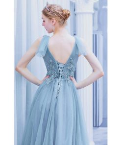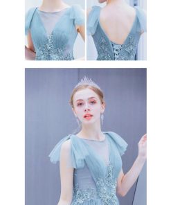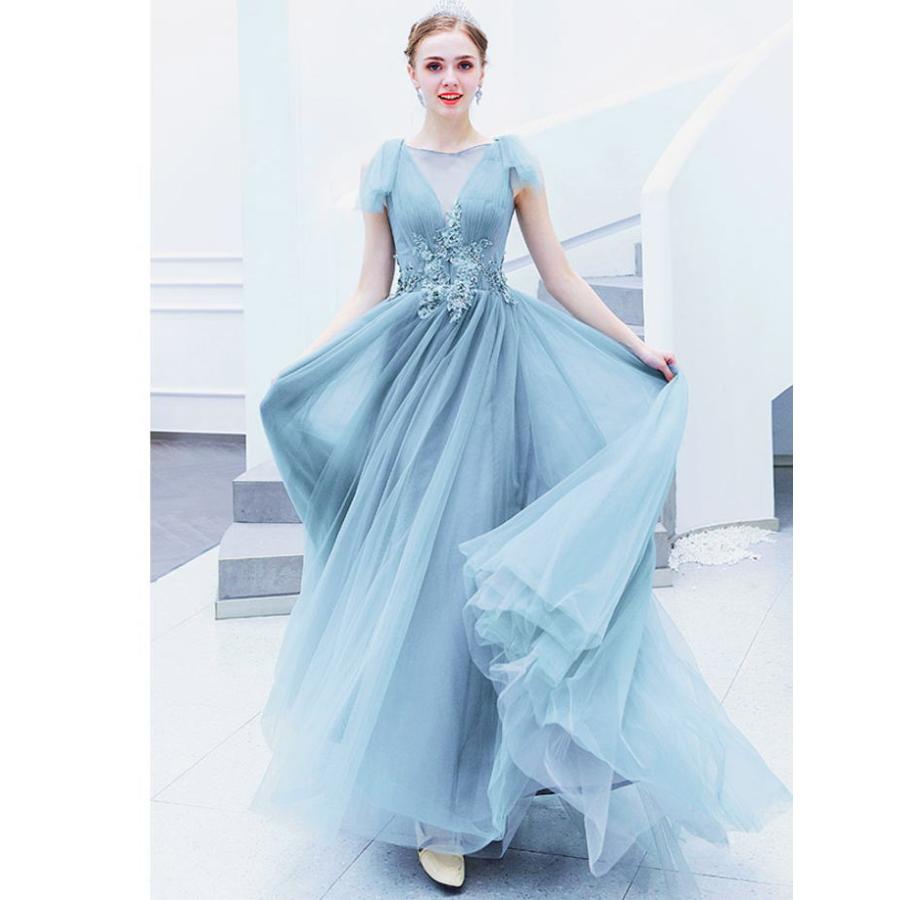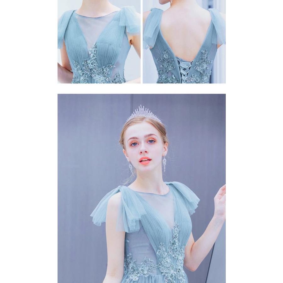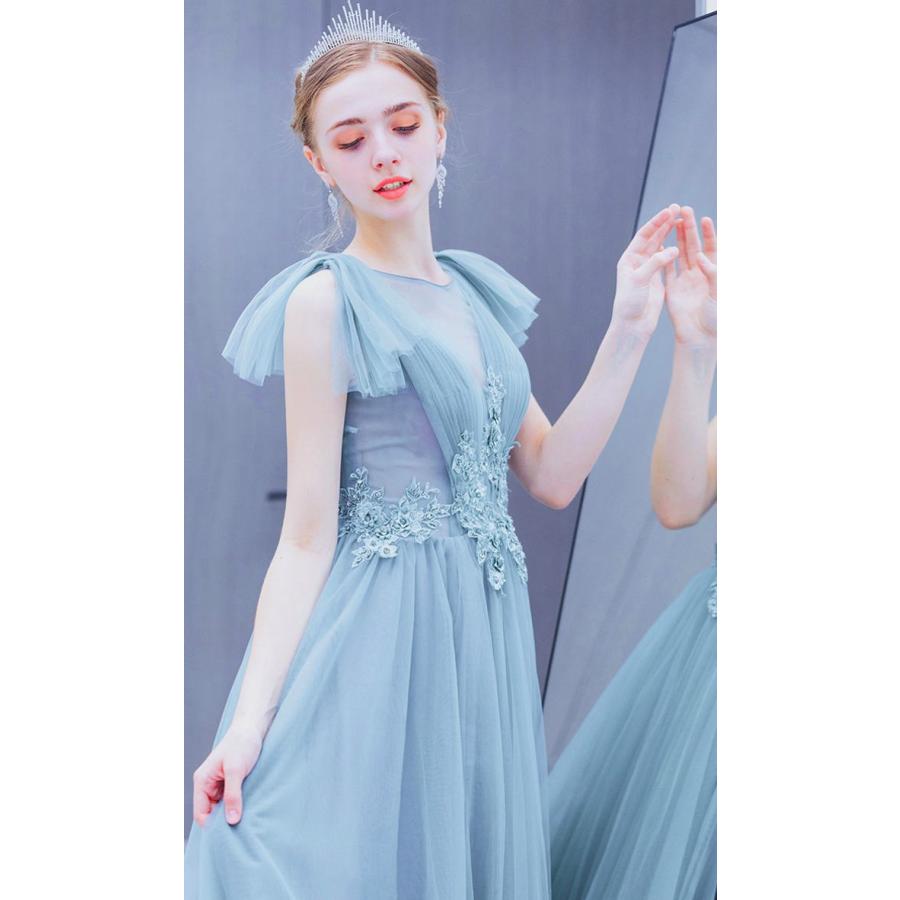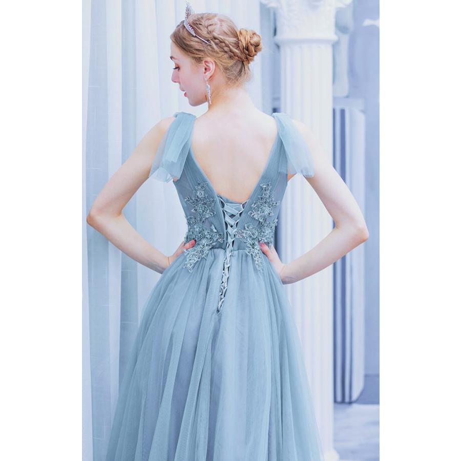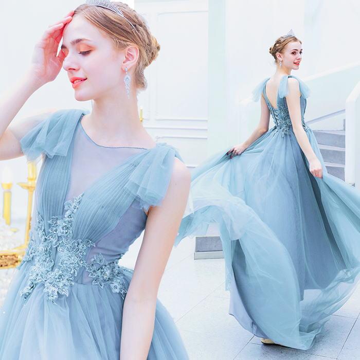 【ANGEL】肌透けチュールレースビーズノースリーブ背中編上げAラインロングドレス【送料無料】高品質 ブルー 水色 ロングドレス パーティードレス【G