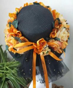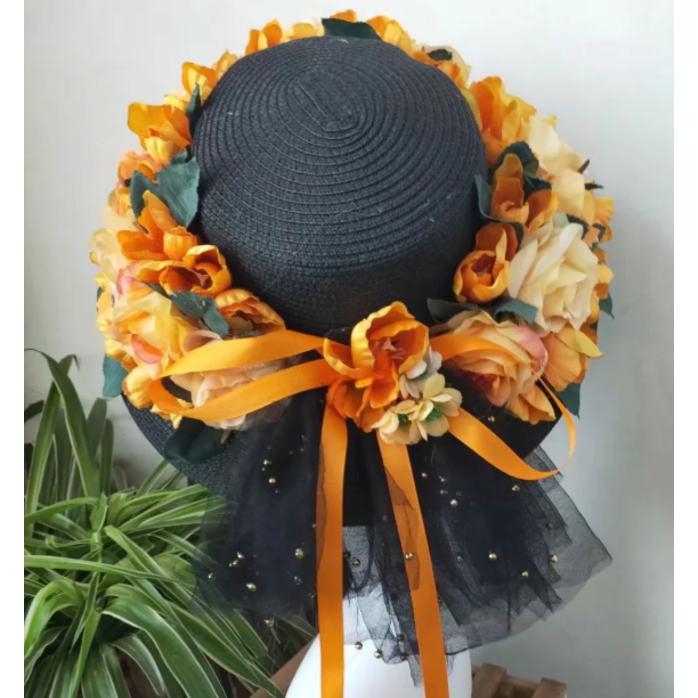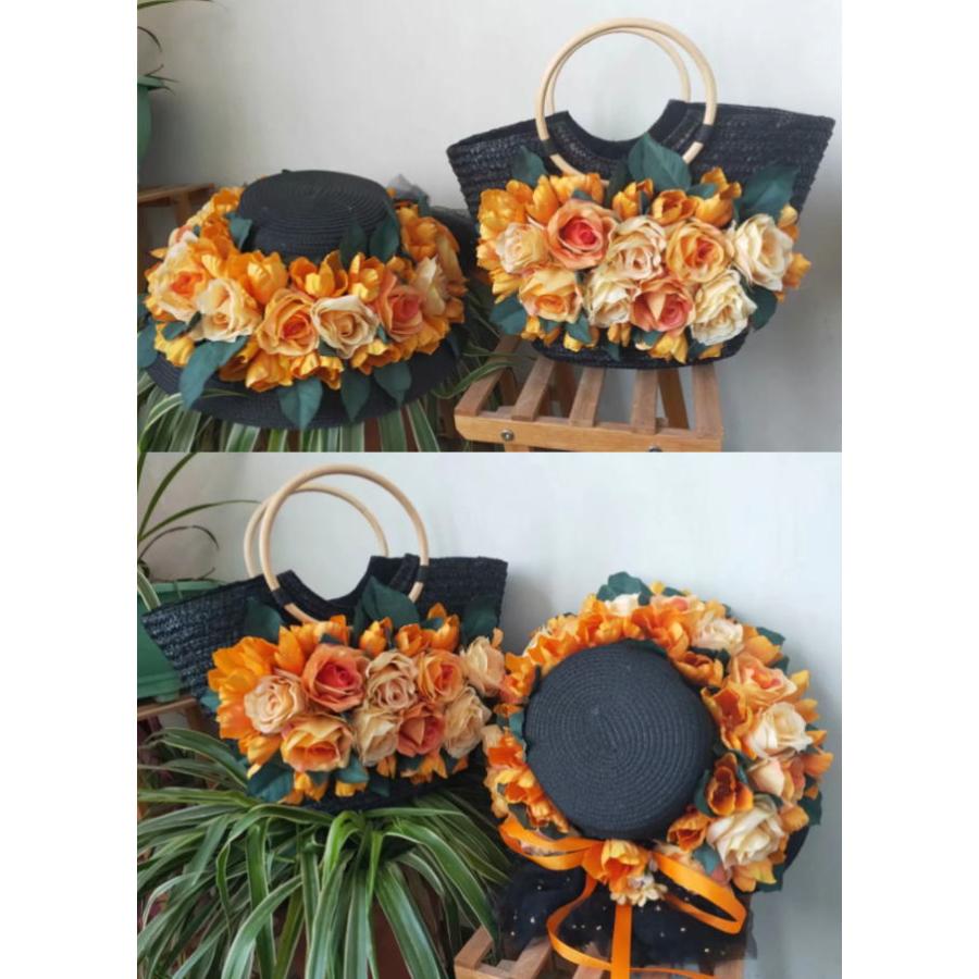 かごバッグ 麦わら帽子 セット ブラック 黒 オレンジ 橙 フラワー 花 お花 リボン カゴバッグ 帽子 ストローハット ハット レディース 籠 バッ