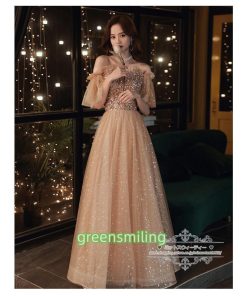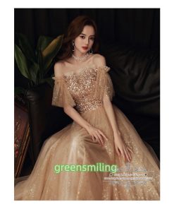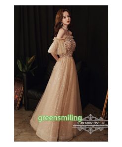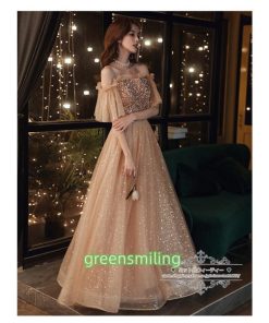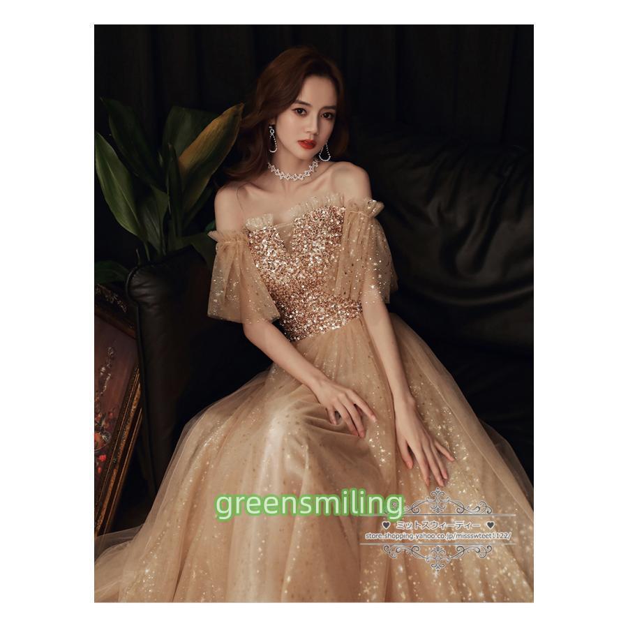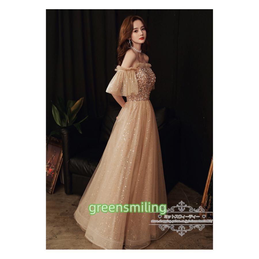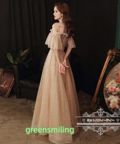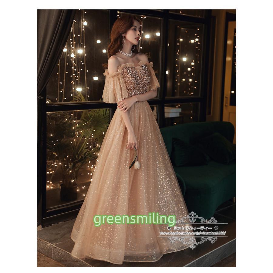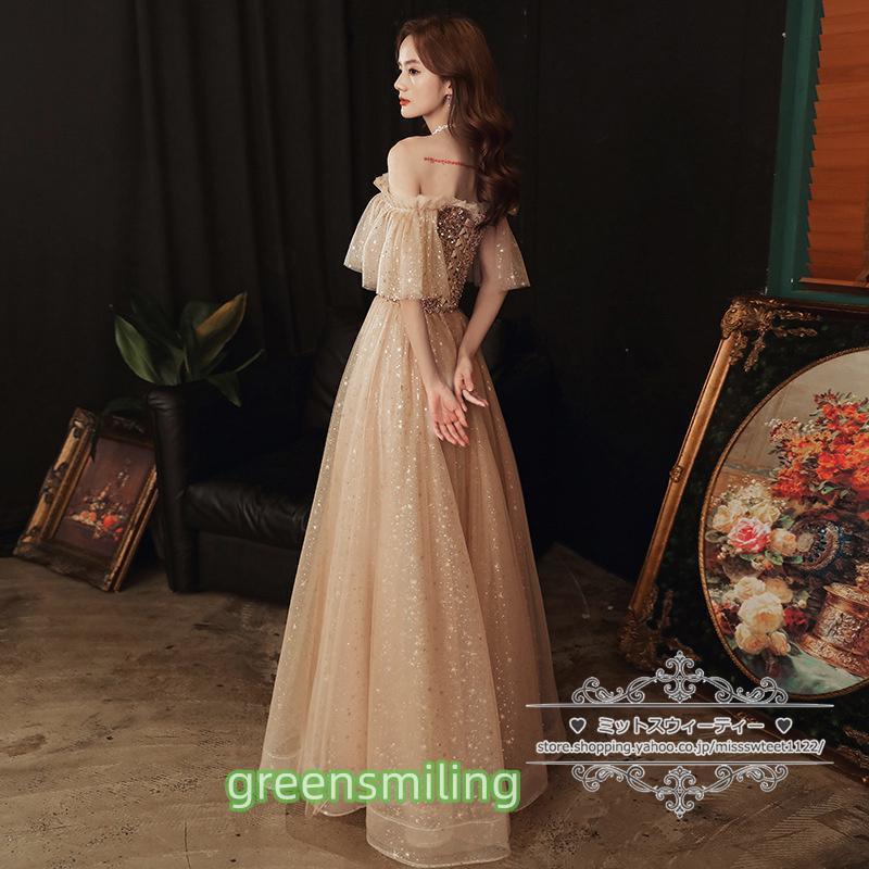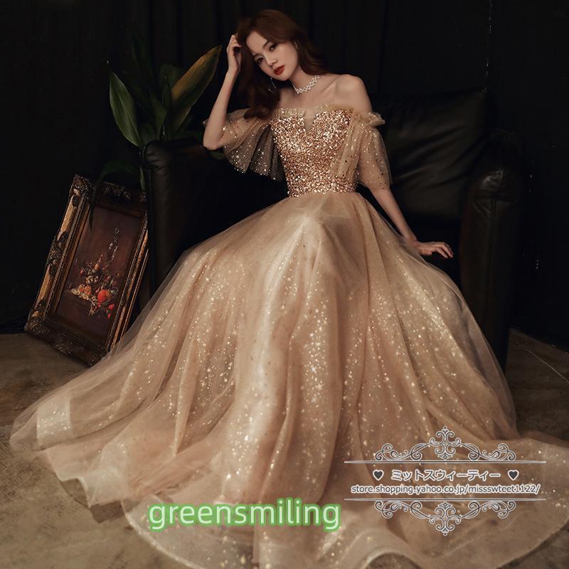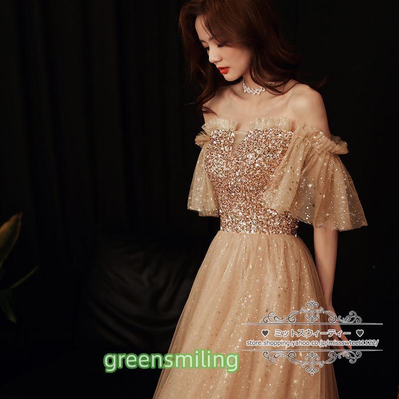 カラードレス カクテルドレス ロングドレス パーティードレス 発表会 演奏会 ステージドレス イブニングドレス 大人 ゴールド オフショルダー 袖付き