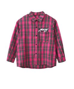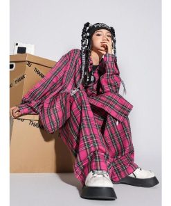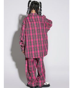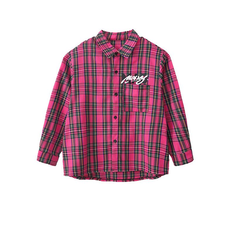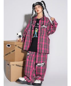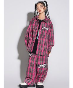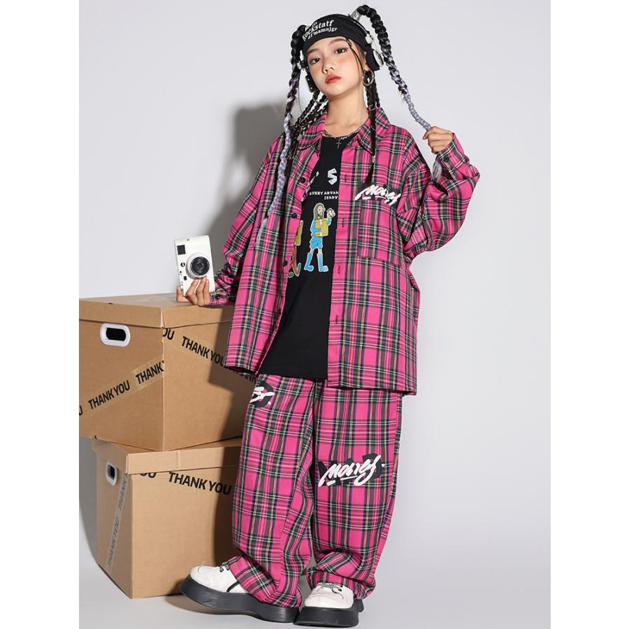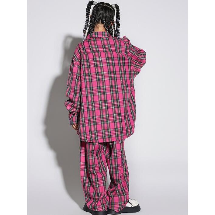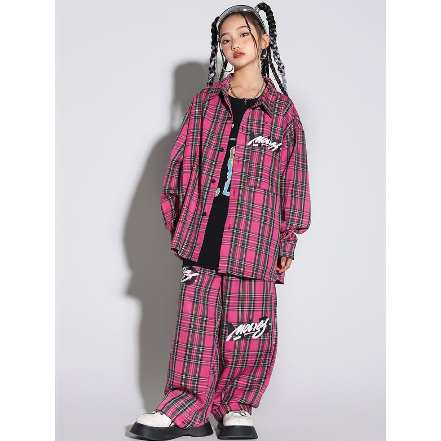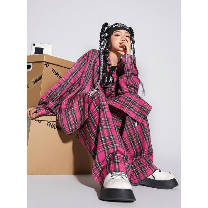 キッズヒップホップダンス 衣装 長袖シャツ チェック柄 ロングパンツ 男女兼用 ダンス衣装 jazz hiphop かっこいい 演出服 子供服 子供シャツ ローズ