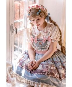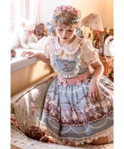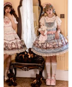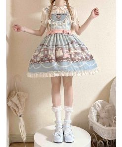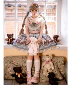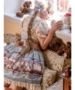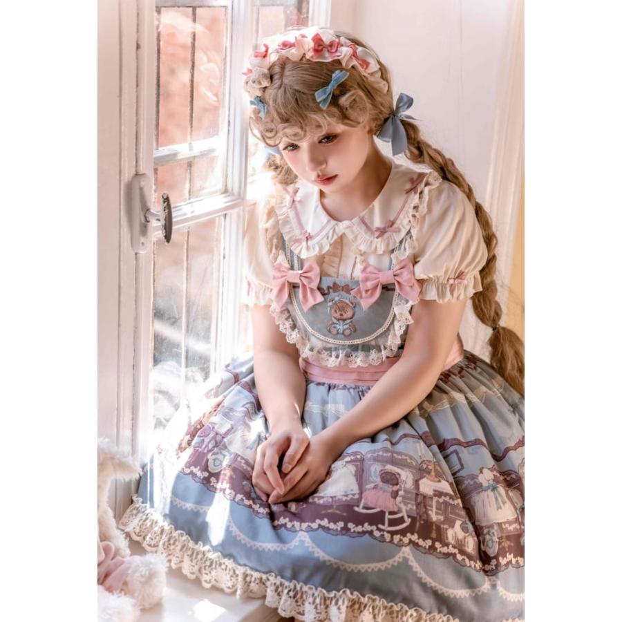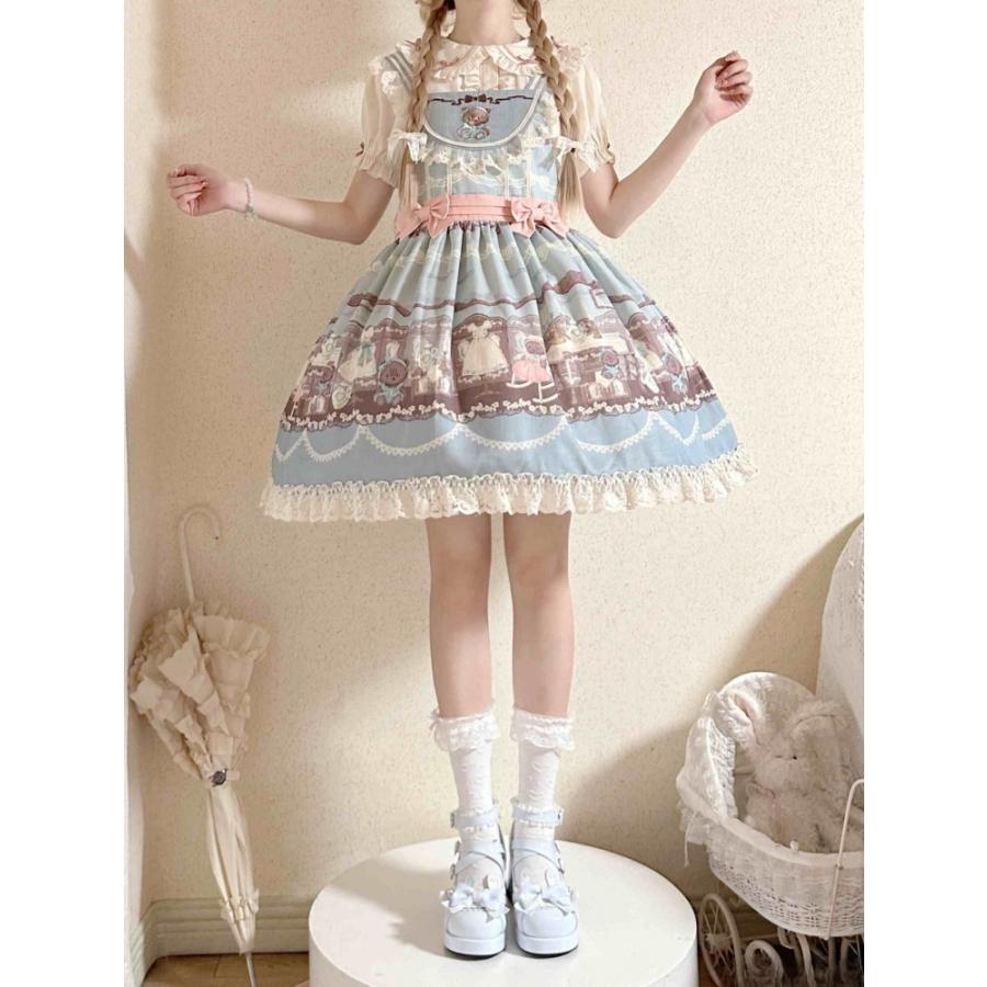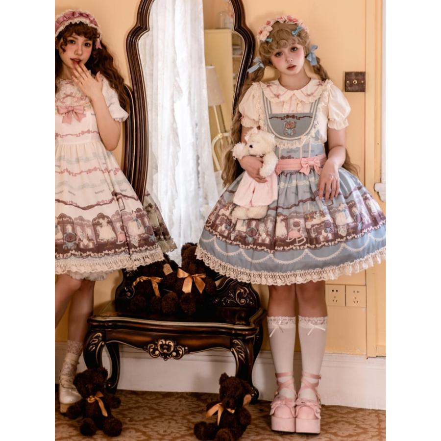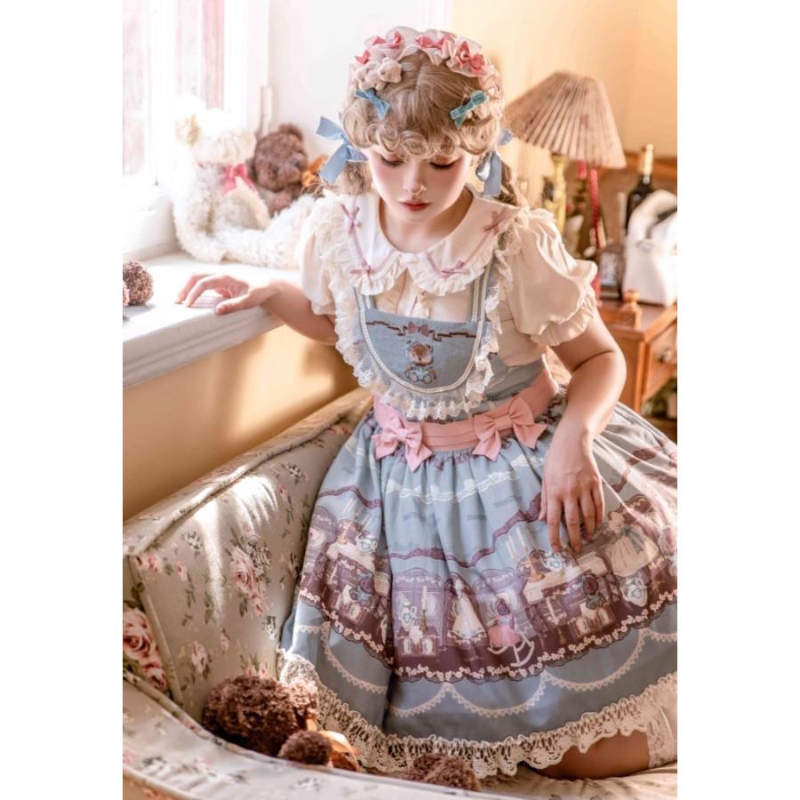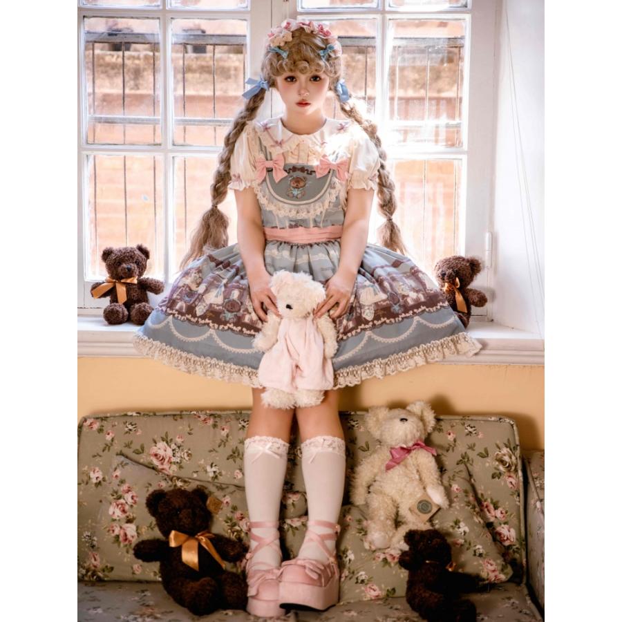クマの刺繍ネックライン ブルー スイート テディ プリント オーバーオール