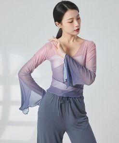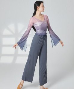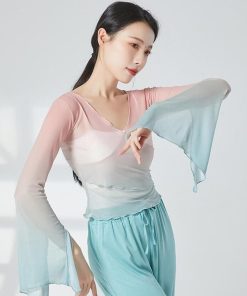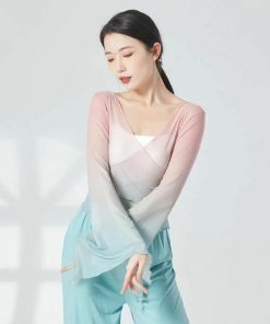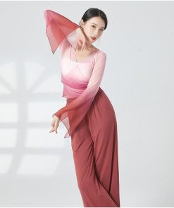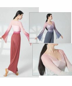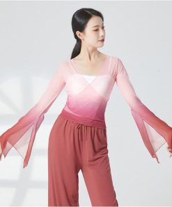 クラシカル ダンス 衣装 レディース グラデーション 古典ダンス 古典舞踊 バレエ 中国踊り 中華民族ダンス 練習着 レッスン着 長袖 袖スリット ラッパ袖 交
