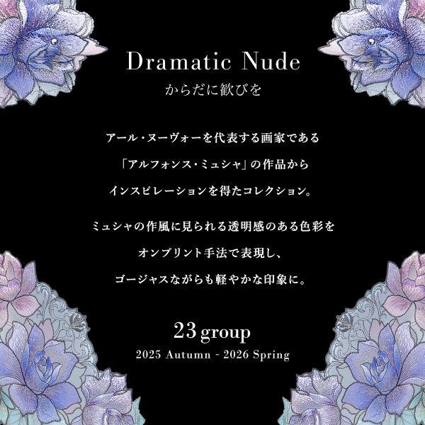 アール・ヌーヴォーを代表する画家である「アルフォンス・ミュシャ」の作品からインスピレーションを得たコレクション。ミュシャの作風に見られる透明感のある色彩をオンプリント手法で表現し、ゴージャスながらも軽やかな印象に。