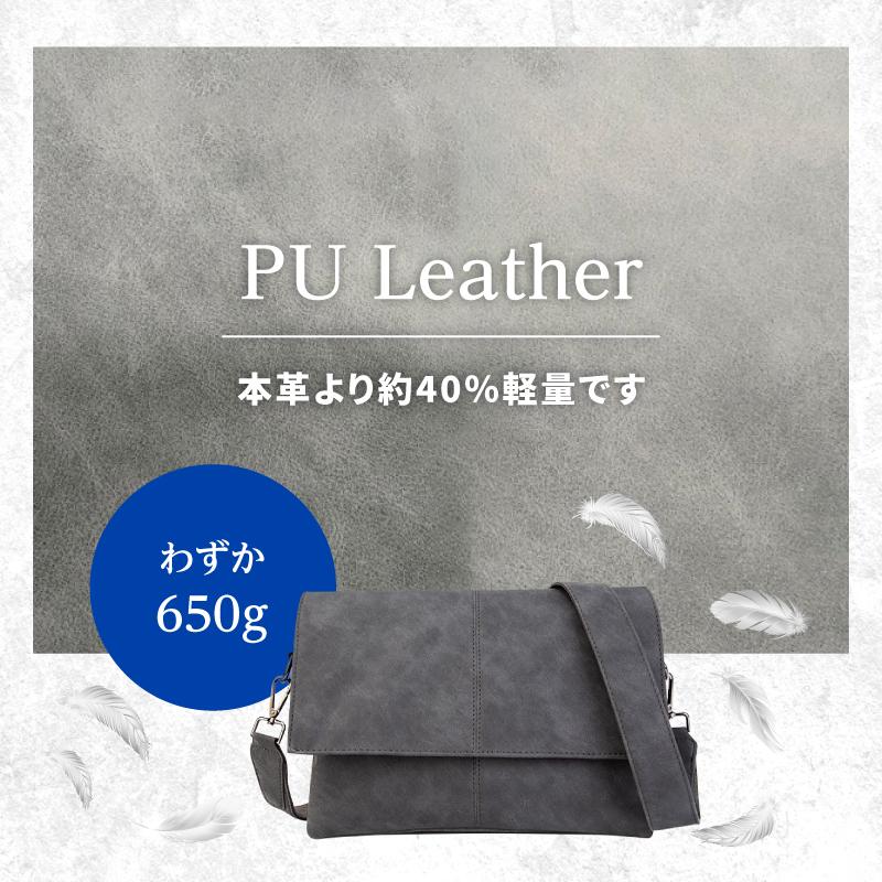 素材には軽量で手入れがしやすいPUレザーを採用。本革に比べて約40%も軽く、撥水性にも優れているため、少々の水濡れや汚れもサッと拭くだけ。