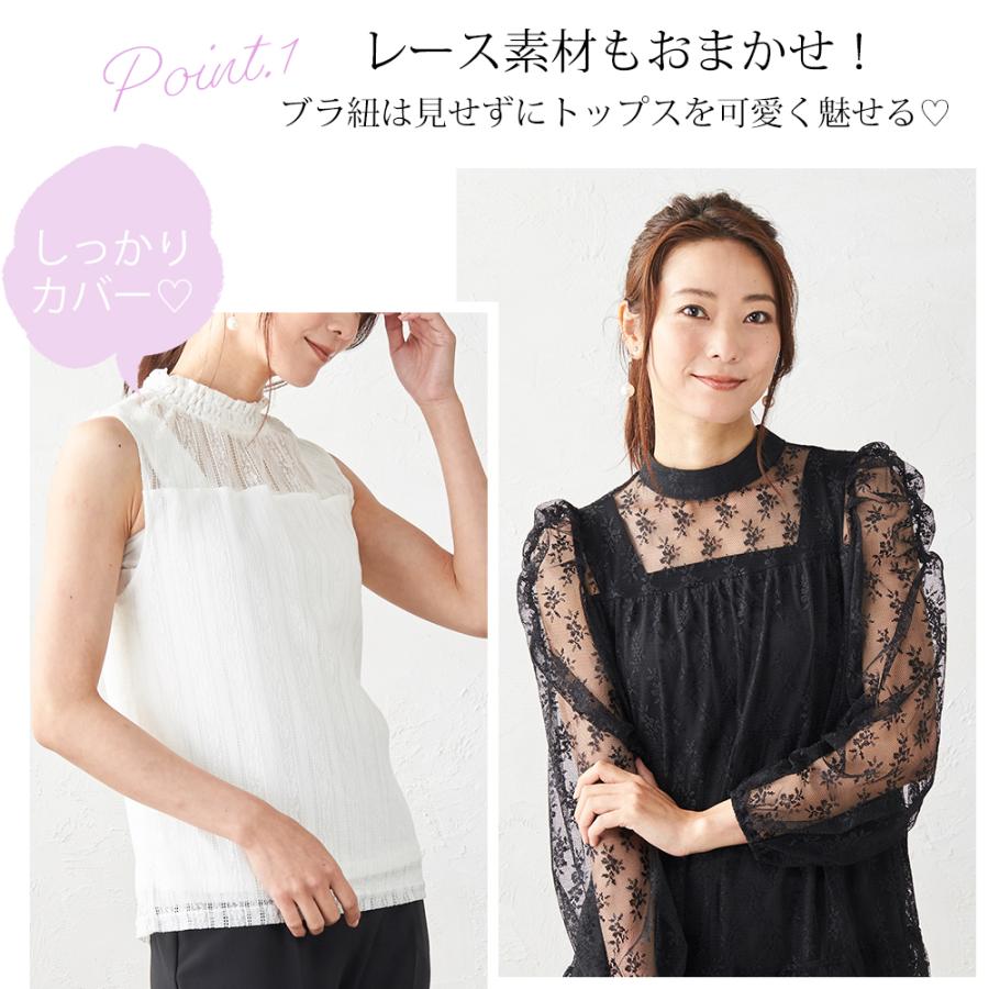 レースやシアー素材のトップスが可愛く着られて、ブラ紐を隠す。