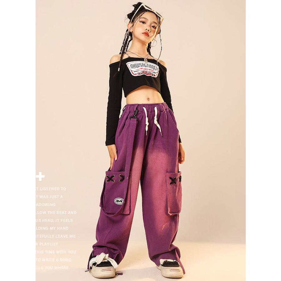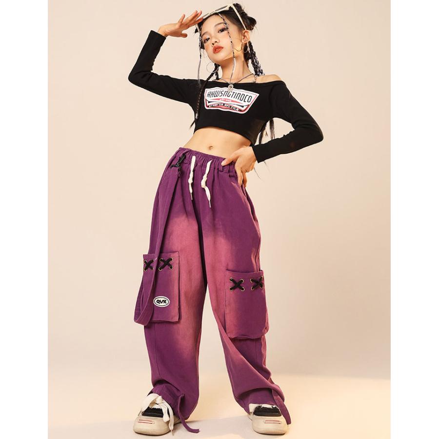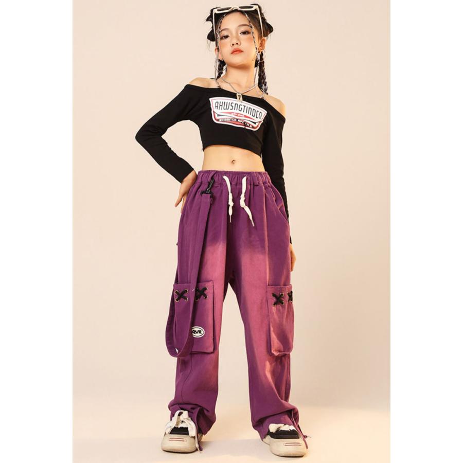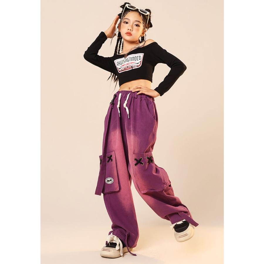 ダンス 衣装 ヒップホップ キッズ へそ出し トップス パープル カーゴパンツ 黒 セットアップ 紫 ズボン 長袖 カーゴ服 韓国 練習着 ガールズ