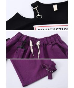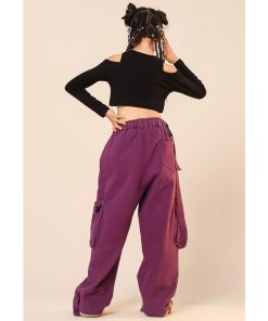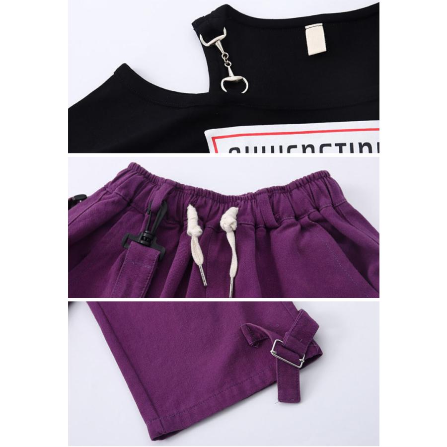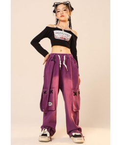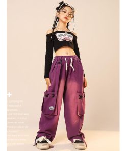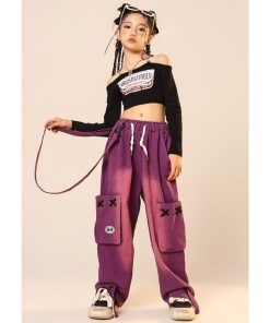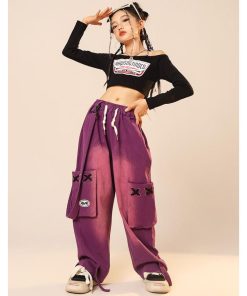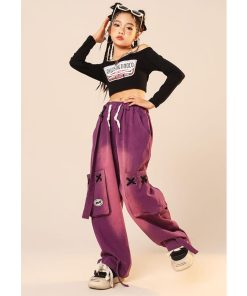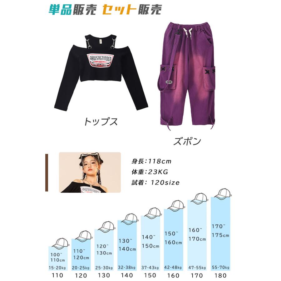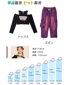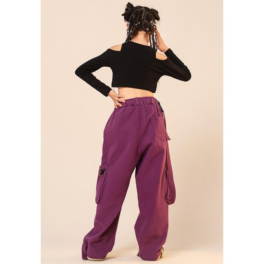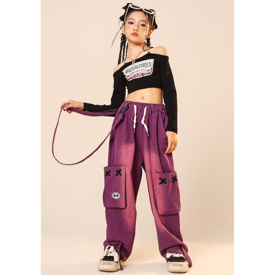 ダンス 衣装 ヒップホップ キッズ へそ出し トップス パープル カーゴパンツ 黒 セットアップ 紫 ズボン 長袖 カーゴ服 韓国 練習着 ガールズ