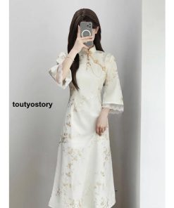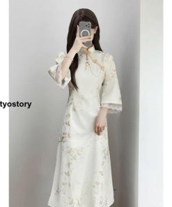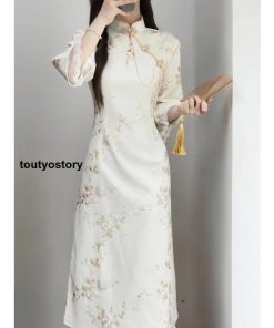 チャイナドレス ロング ワンピース マキシ 花柄 七分袖 チャイナ服 ロングチャイナドレス