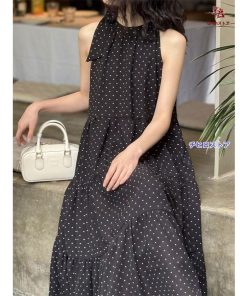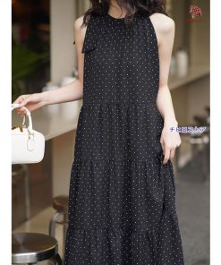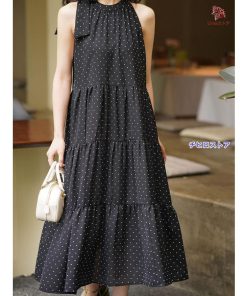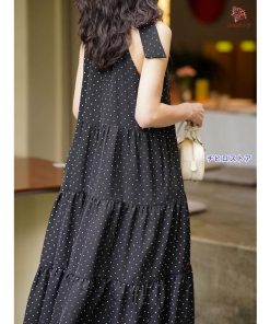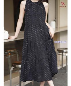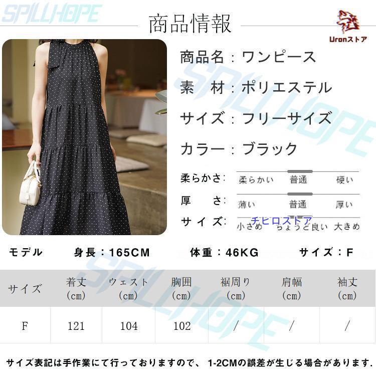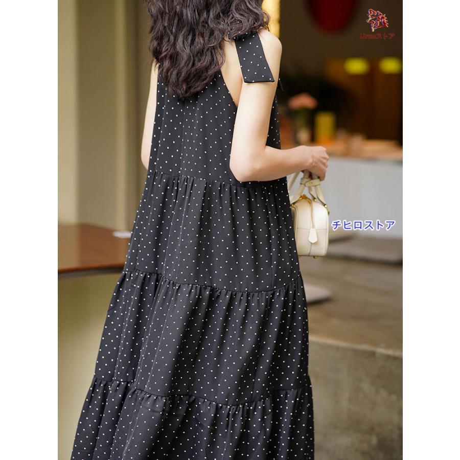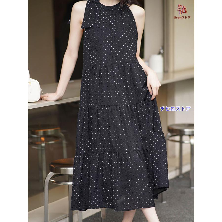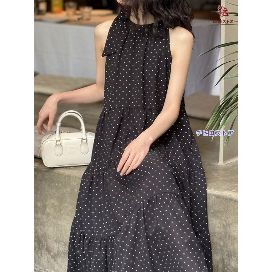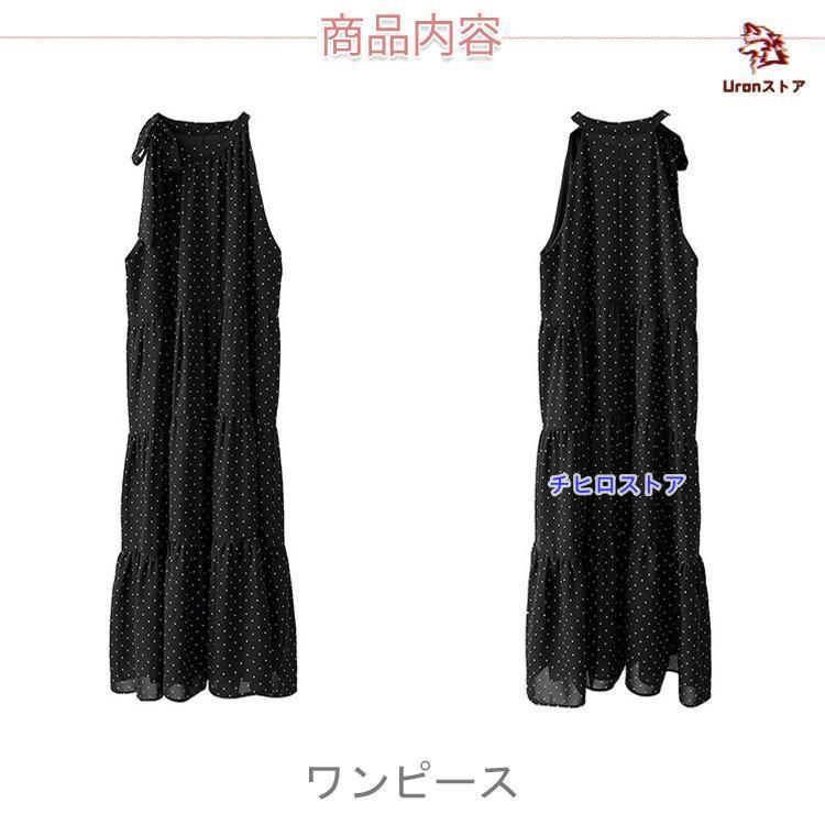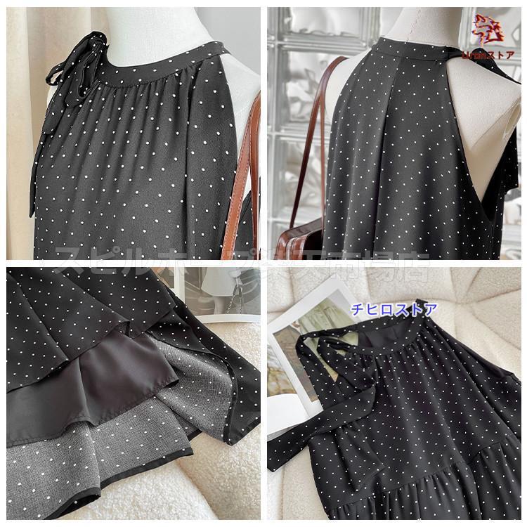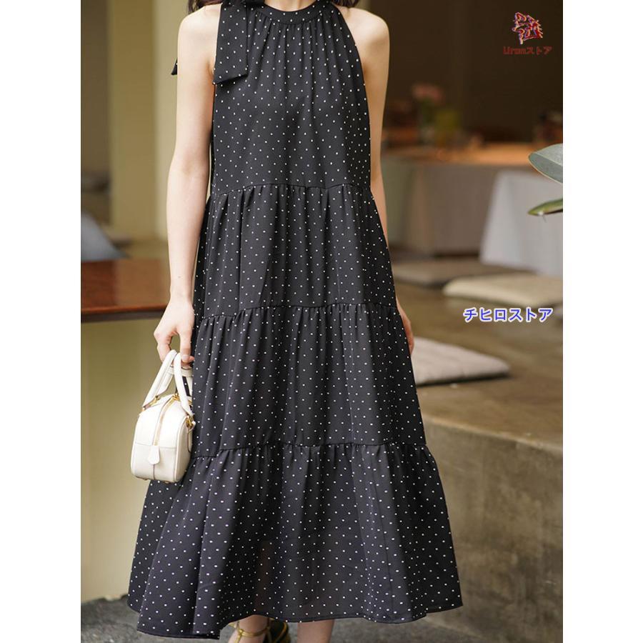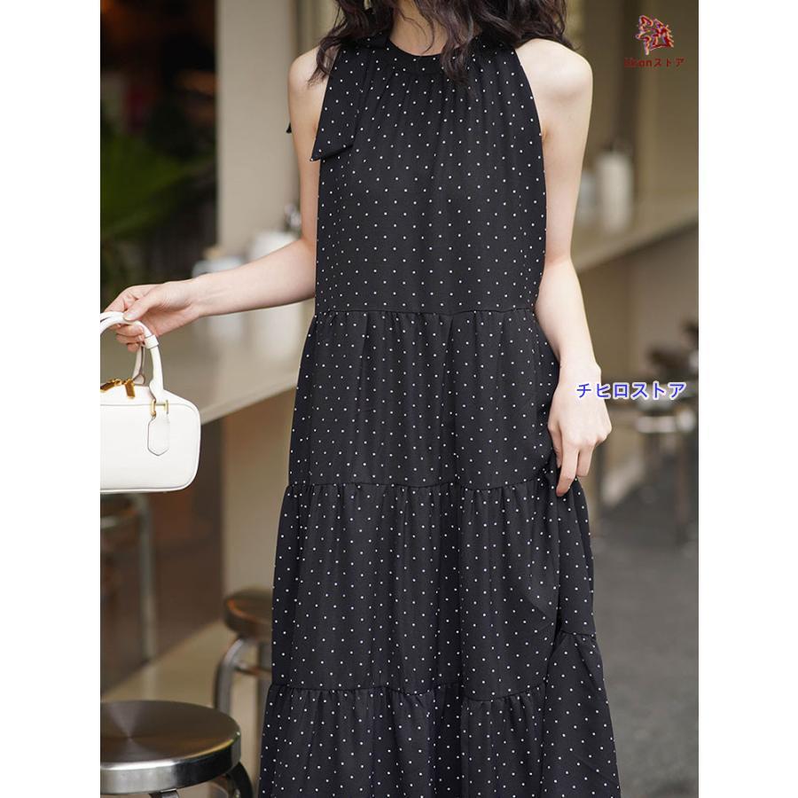 ノースリーブワンピース 水玉 総柄 レディース リボン ブラック Aライン 通勤 オフィス おしゃれ 女性 きれいめ ゆったり ロングワンピース 上品 クルーネック
