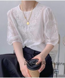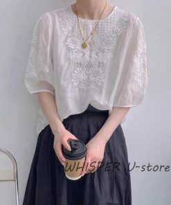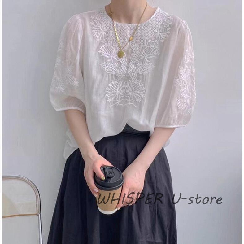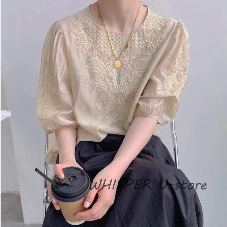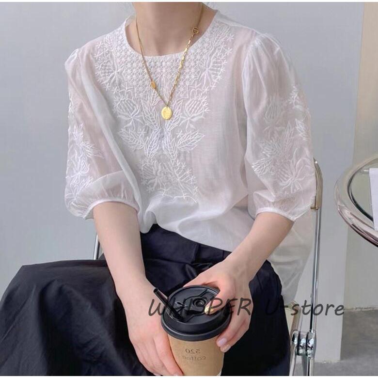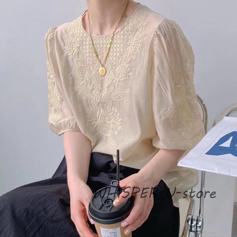 ブラウス レディース 40代 春夏 オシャレブラウス レースシャツ 半袖 刺繍 上品 パフスリーブブラウス 大人 通勤 ゆったり シャツ 韓国風 30代 50代