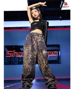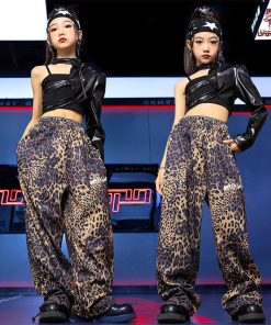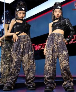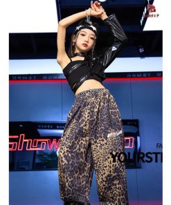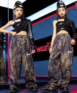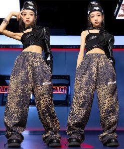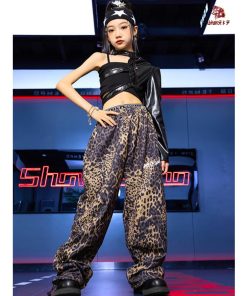 ブラック トップス 豹柄 ウェストパンツ キャミソール キッズ ダンス衣装 韓国 jazz セットアップ おしゃれ 女の子 かっこいい かわいい ゆったり 半袖 へそ出し