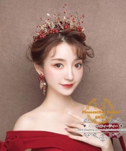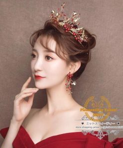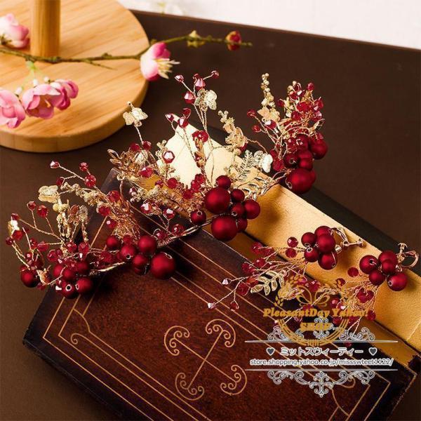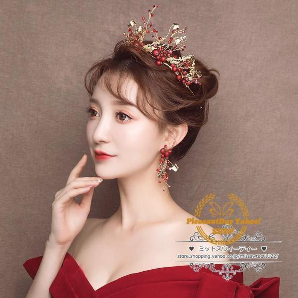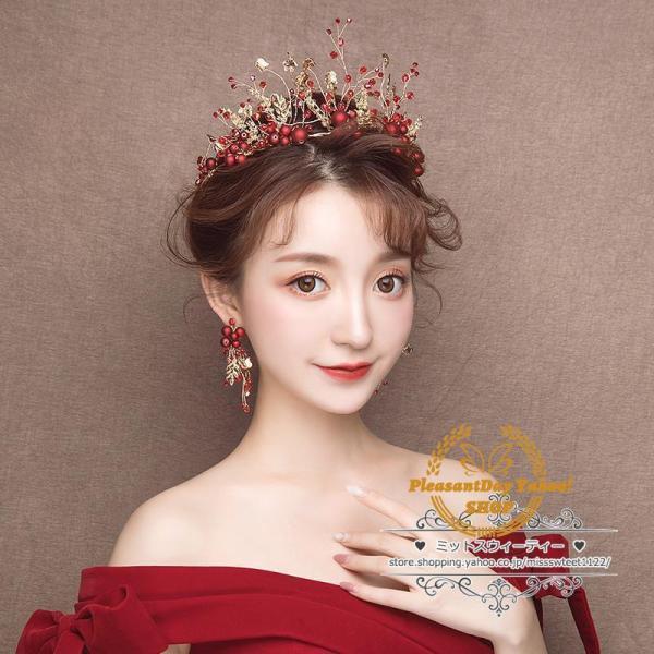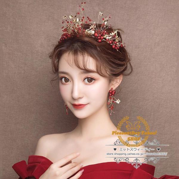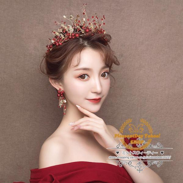 ヘアアクセサリー ティアラ+イヤリング ウェディング小物 ヘッドドレス 結婚式 二次会 披露宴 花嫁 ブライダル ウエディング パーティー 赤 レッド クラウン