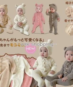 ベビー ロンパース くまちゃん 着ぐるみ もこもこ カバーオール ベビー服 足つき くま耳 ボンネットつき 男の子 女の子 長袖 おしゃれ 可愛い 66 73 80 90 100