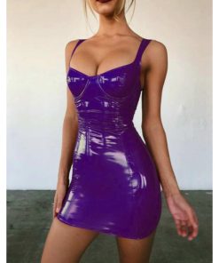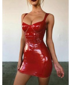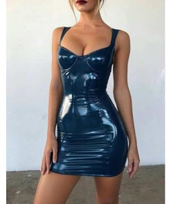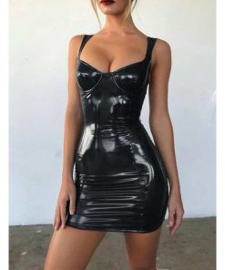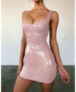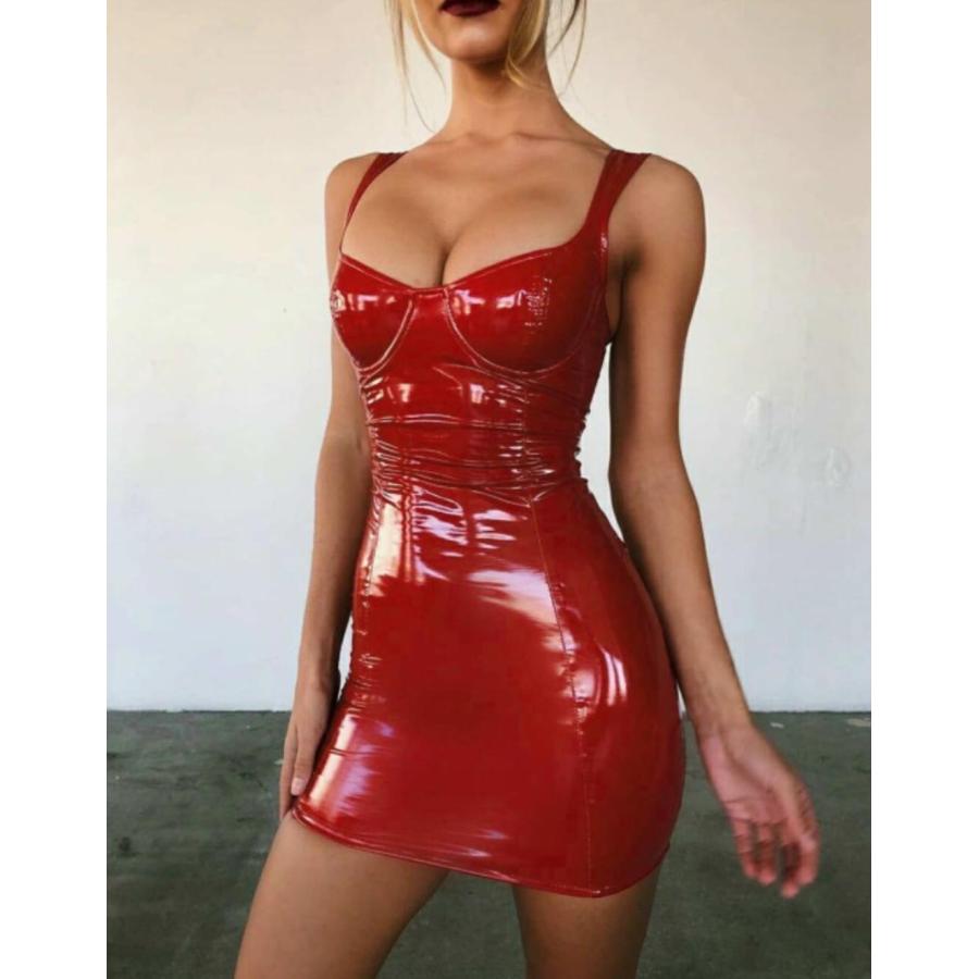 レザーワンピース ミニ ショート丈 キャミソール フェイクレザー ワンピース エナメル 光沢 タイツ タイト 美背 大人 ダンス衣装 演出服 舞