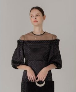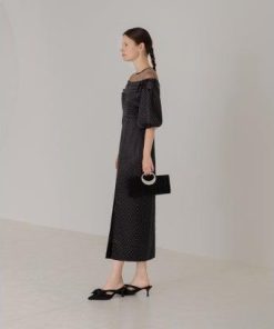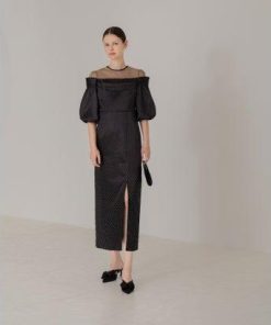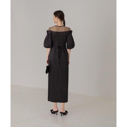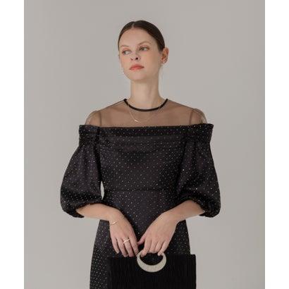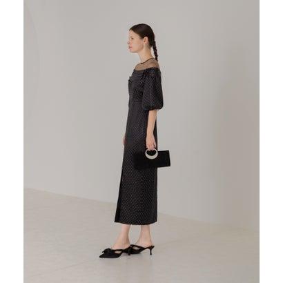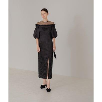 レジャ Leja ドットストーンパフスリーブスリットIラインドレス美脚効果結婚式 パーティードレス 成人式 20代 30代 40代 (BLACK)