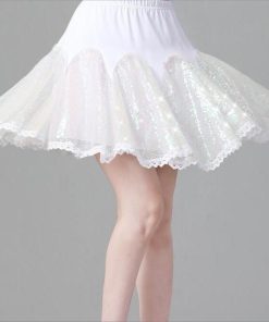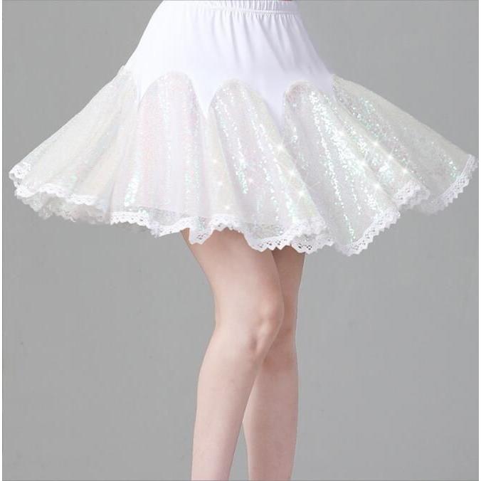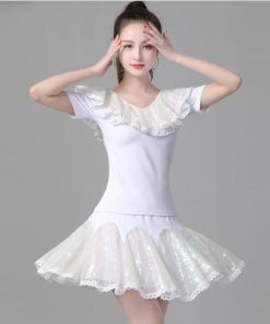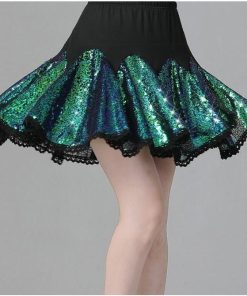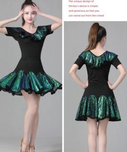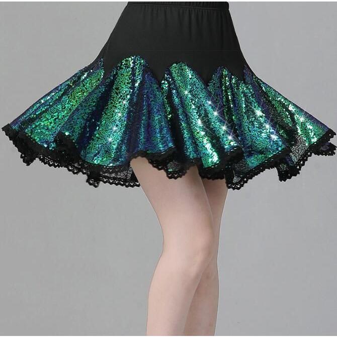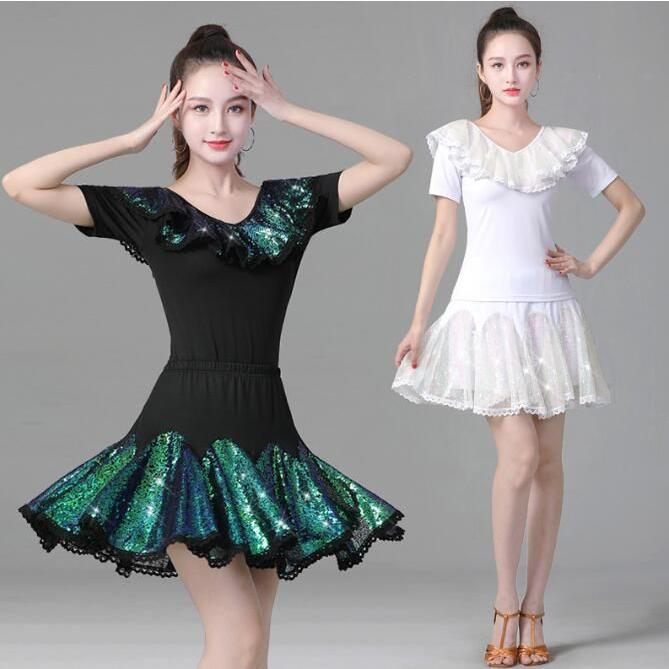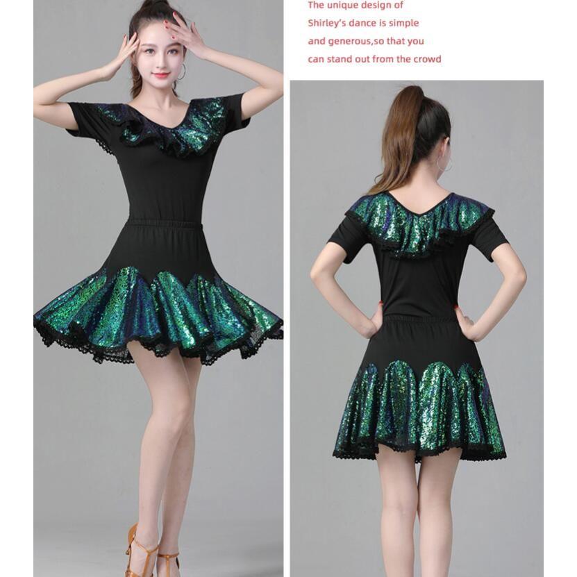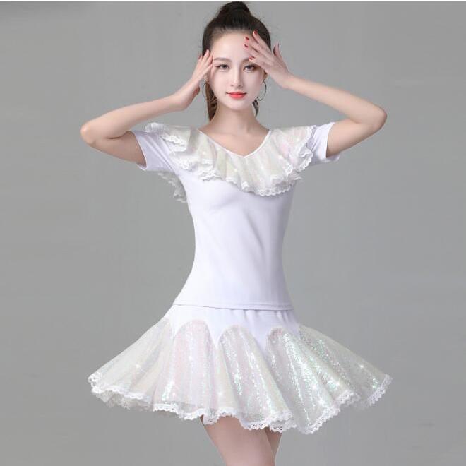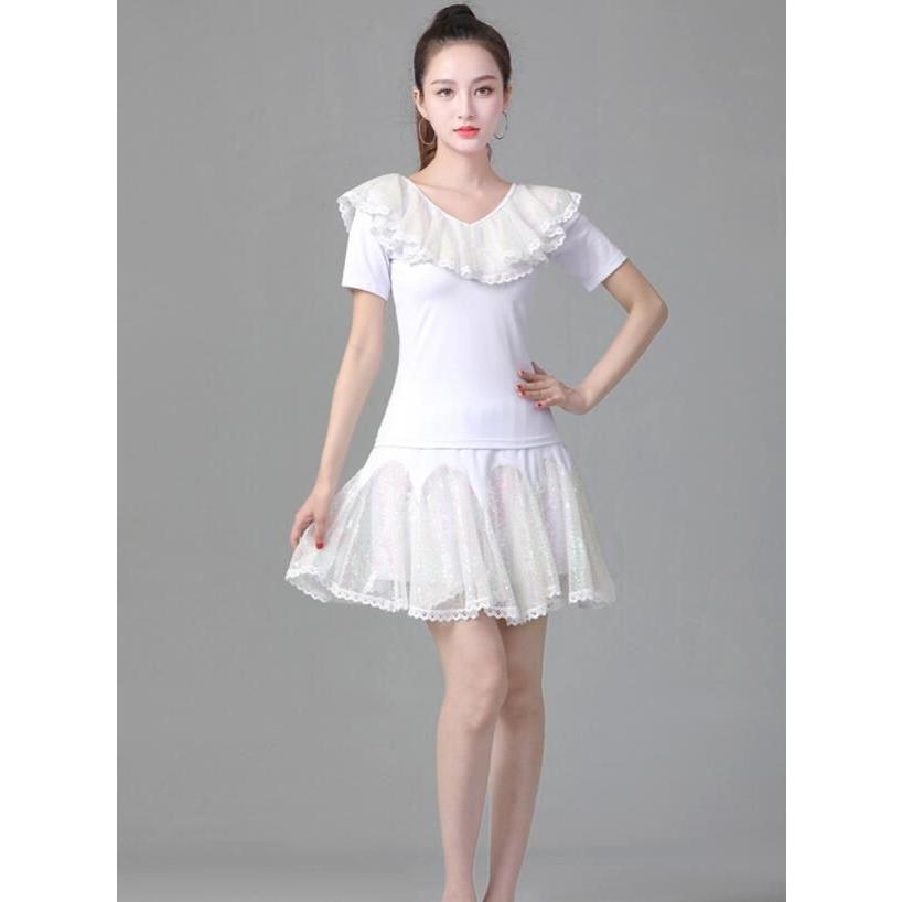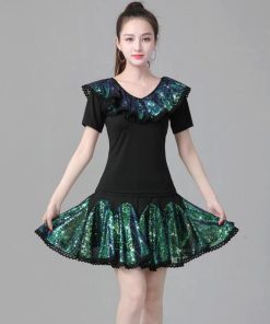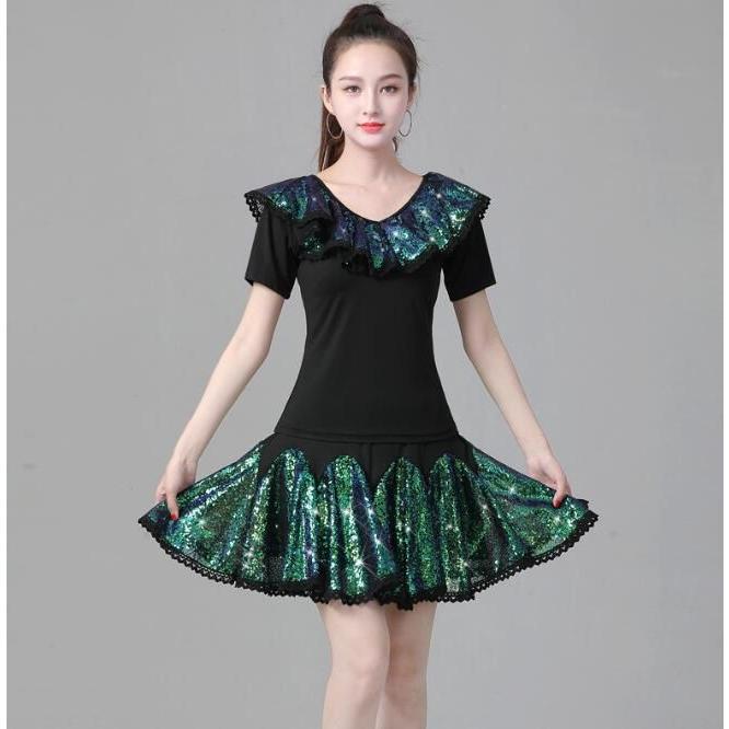 レディース ラテンダンス衣装 半袖 Vネック Tシャツ フレア 広がる ミニスカート 変色 カラースパンコール フリル付き きらきら 大人 社交ダンス モダンダンス