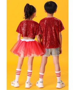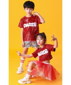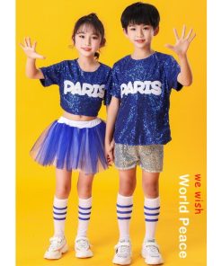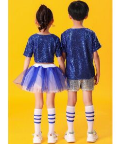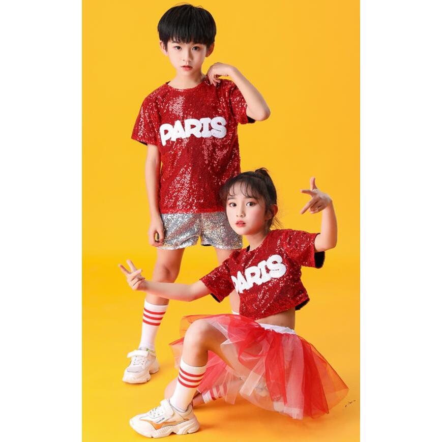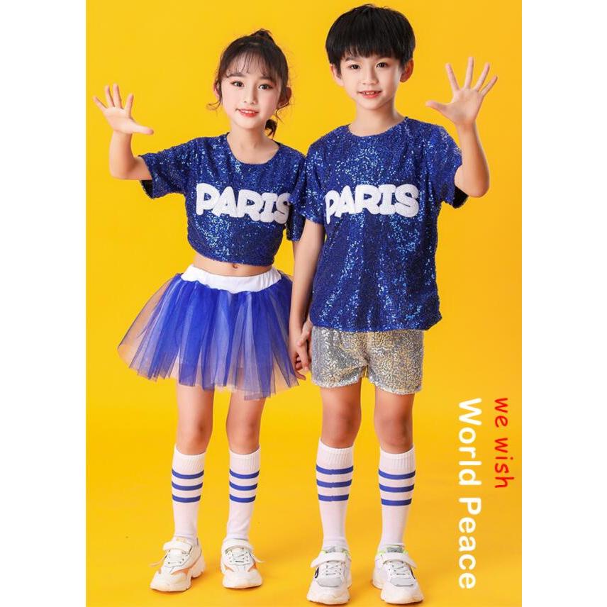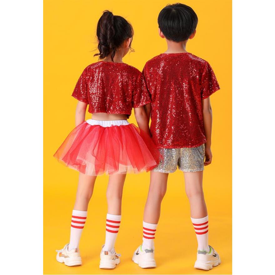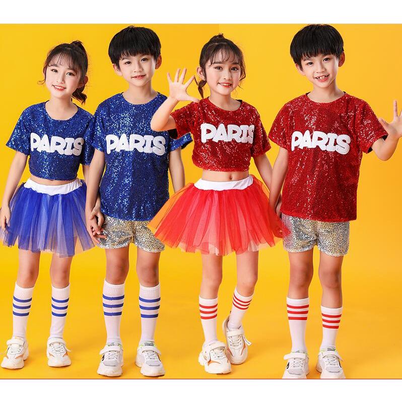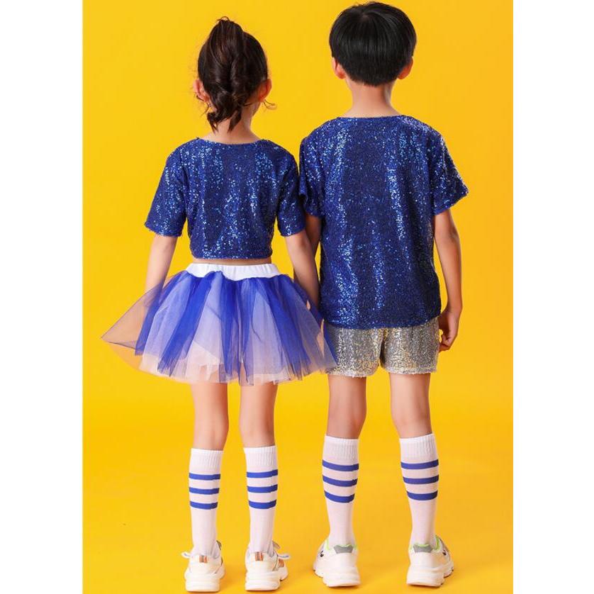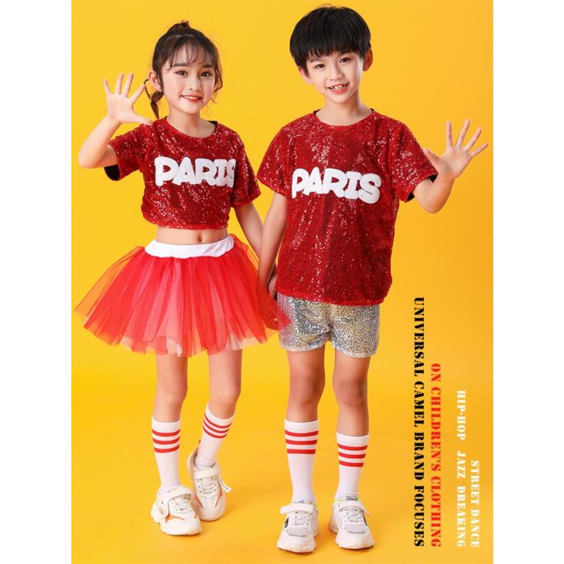 子供ダンス衣装 チアダンス 上下2点セット運動会 応援団上下女の子 男の子 キッズ スパンコール舞台ステージ衣装半袖ブラウス+ショートパンツ/チュチュスカー