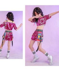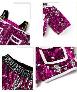 子供服 ダンス衣装 キッズ 女の子 上下セット ヒップホップ ジャズダンス スパンコール 半袖 肩出し ヘソ出し ショートパンツ キラキラ 舞台衣装 韓国風 可愛い