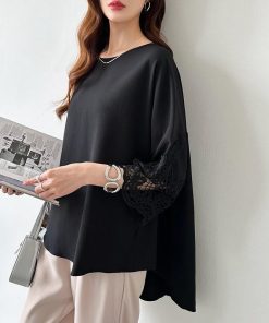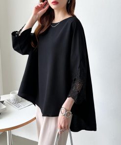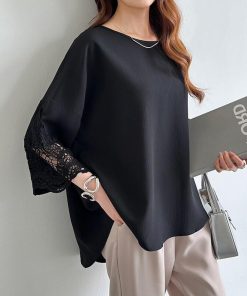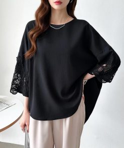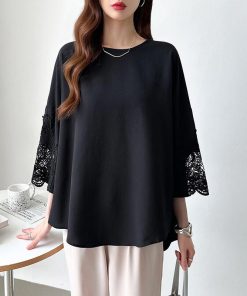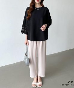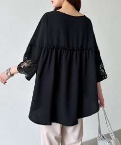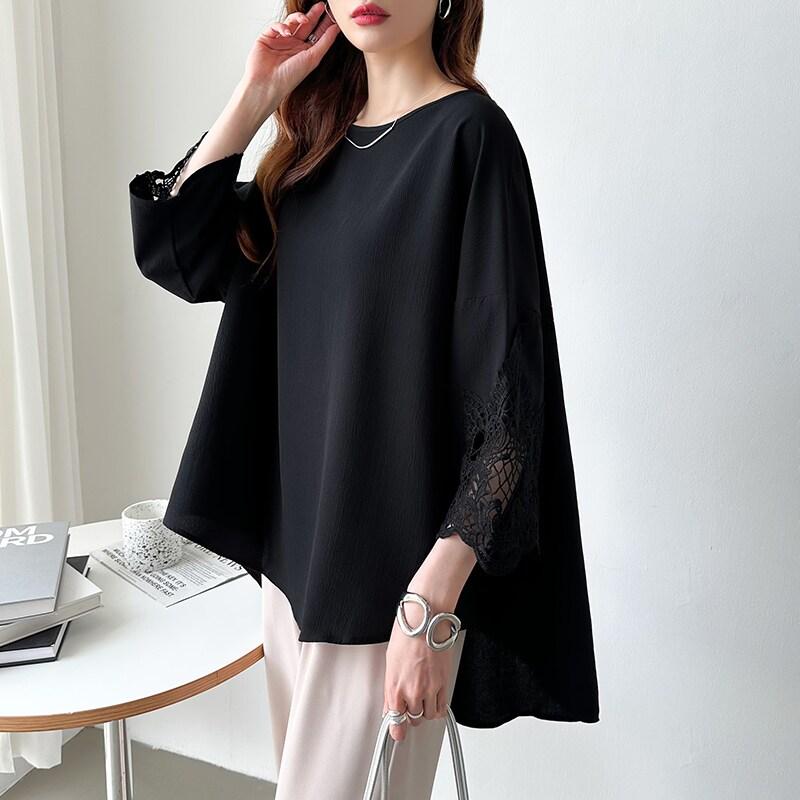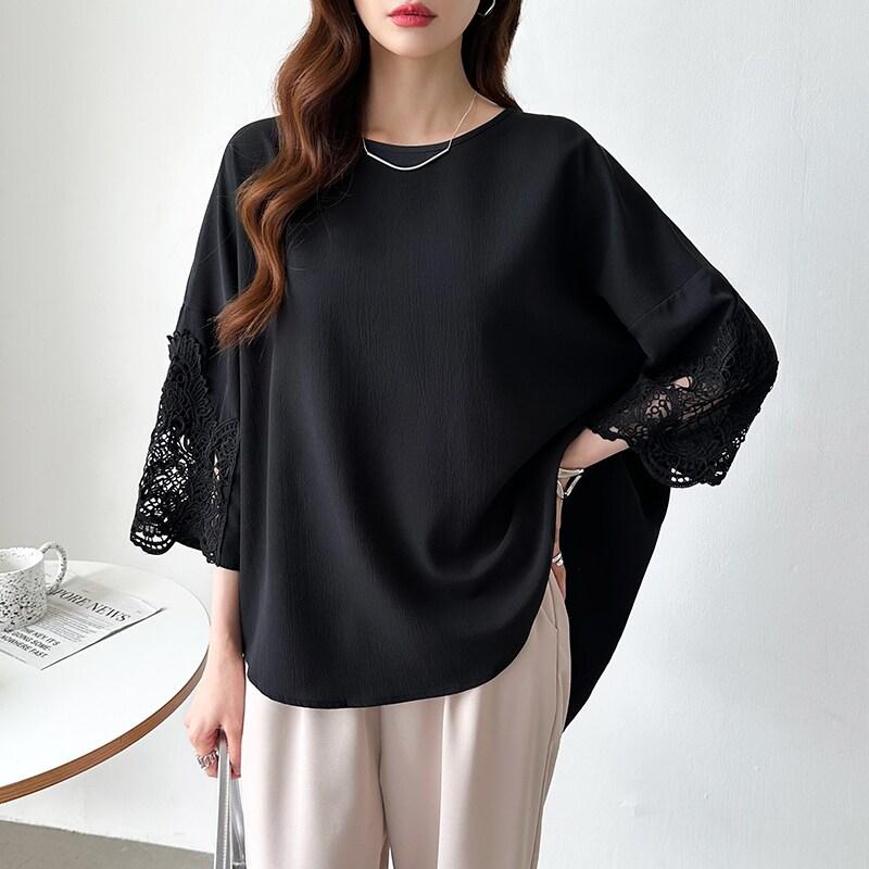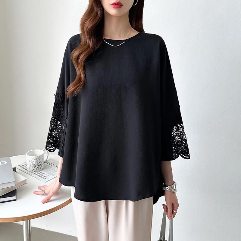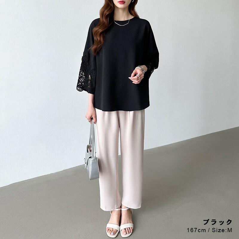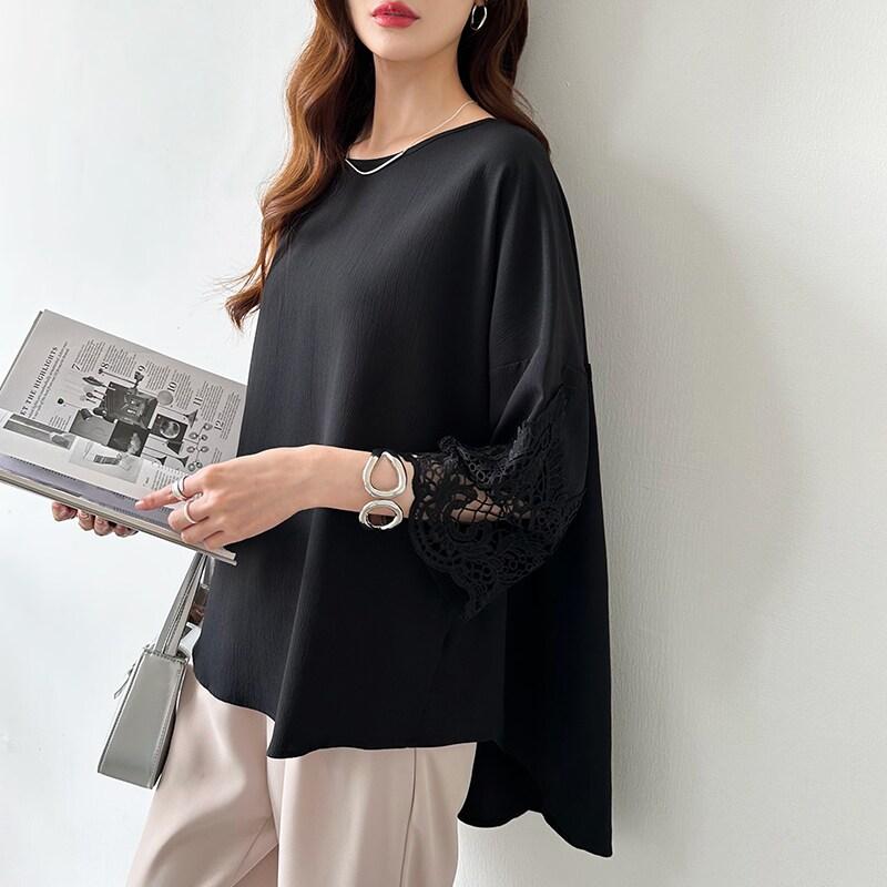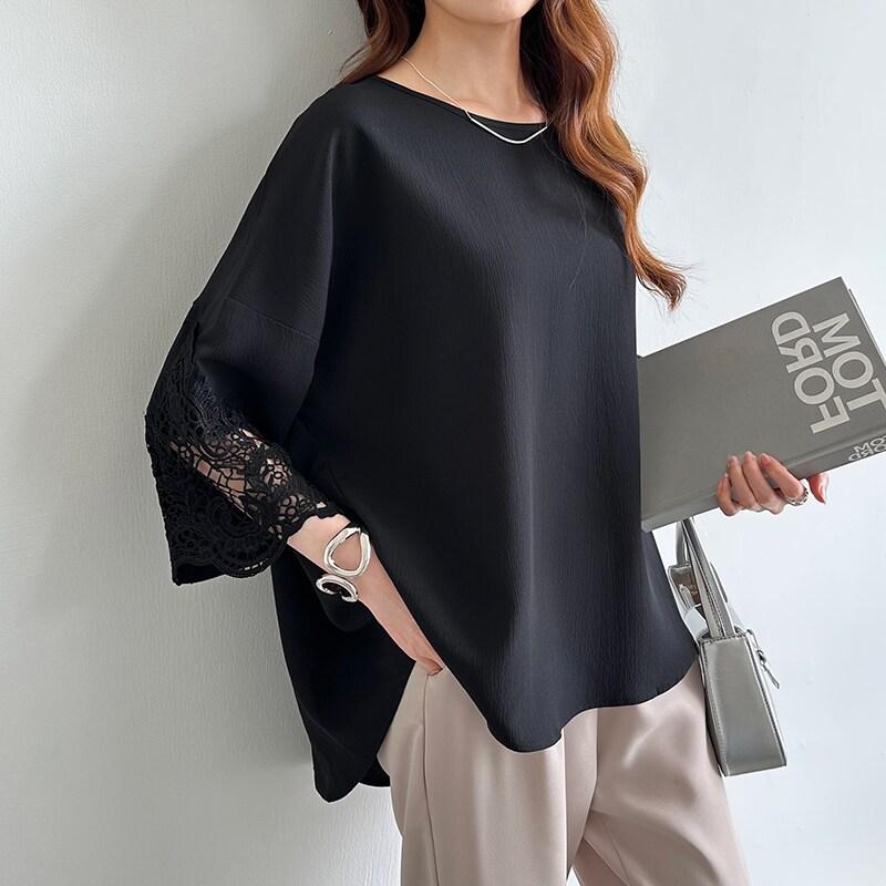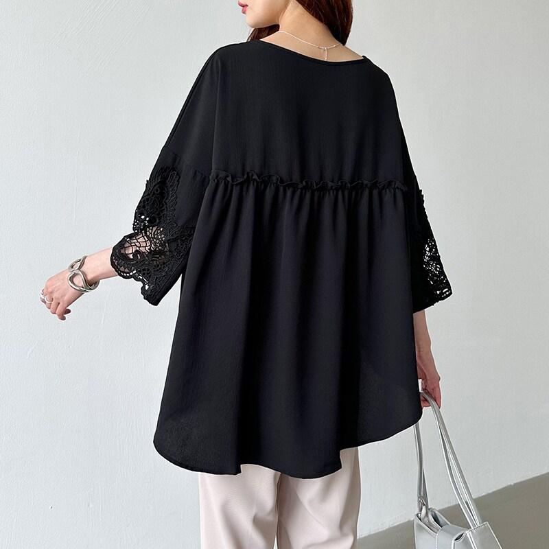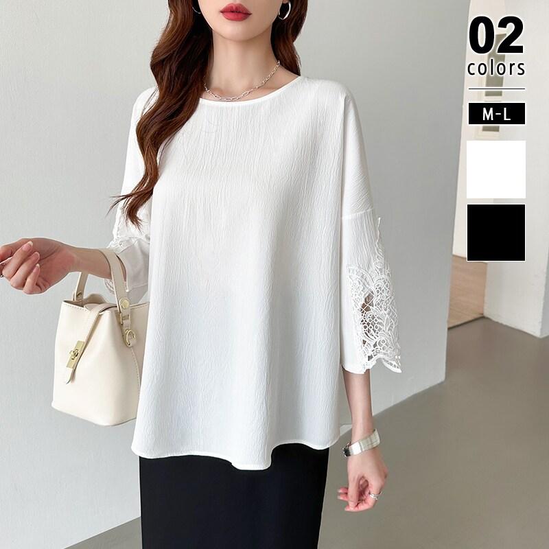 商品名:袖レース ブラウス チュニック ゆったり 体型カバー 七分袖 レディース トップス 刺繍レース 楊柳