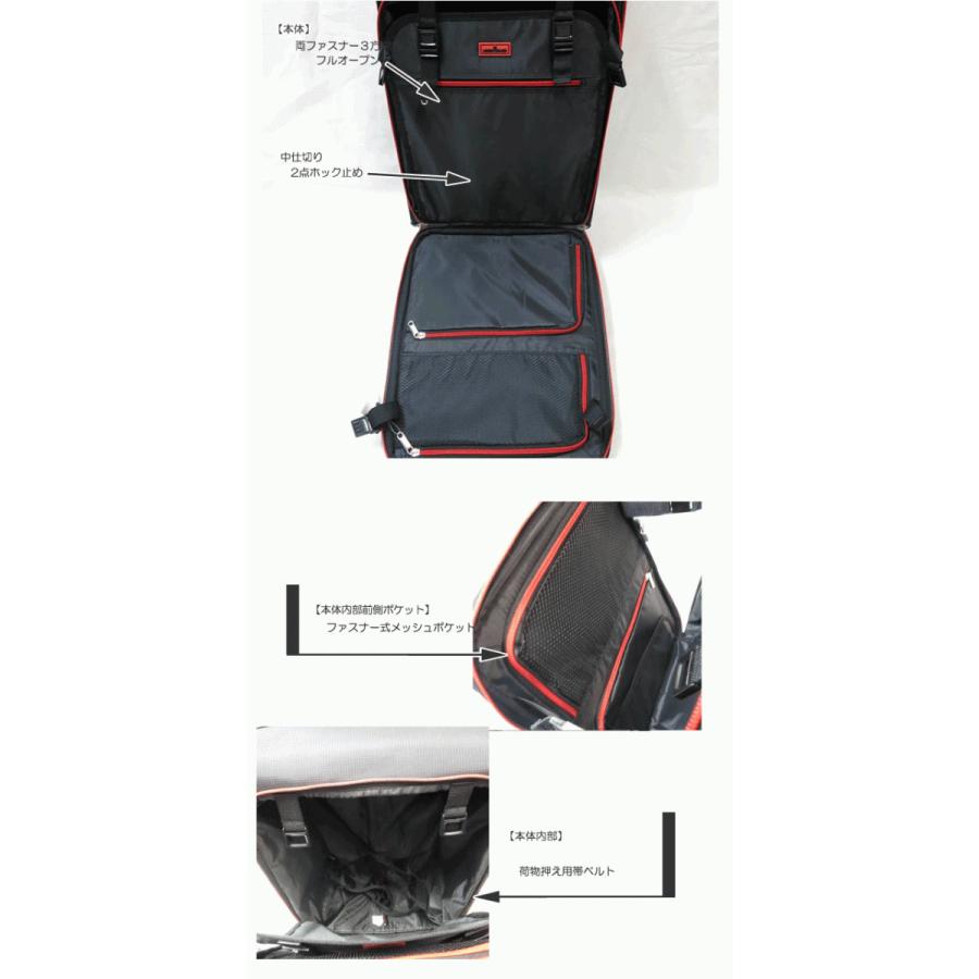 縦開きタイプで中身の飛び出しを防ぐサイドベルトが付属しているので、全開しなくても荷物の出し入れが簡単にできます。
