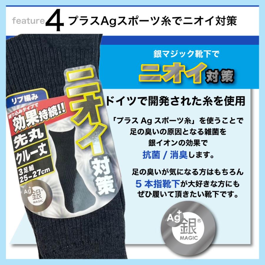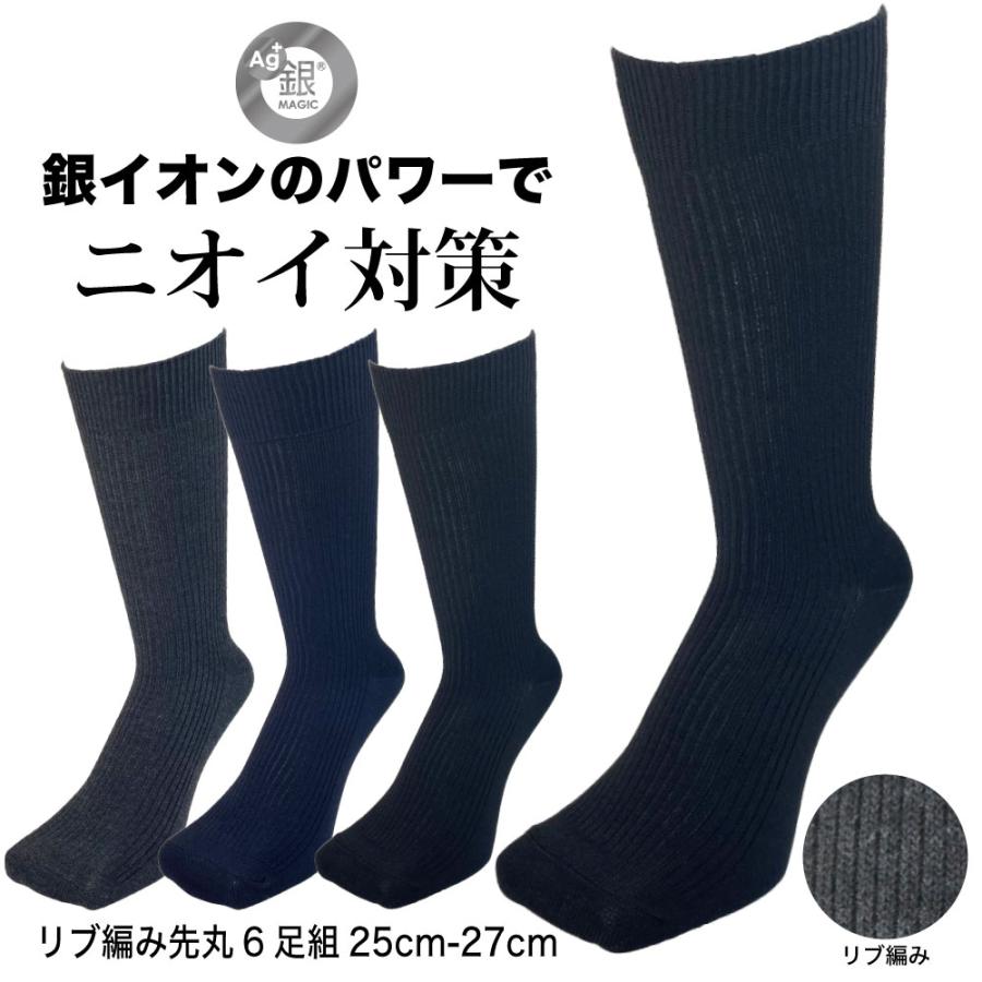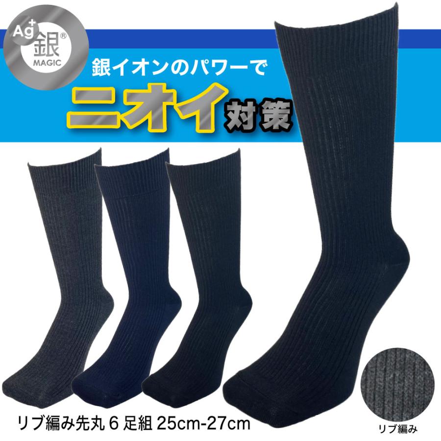 靴下 メンズ 防臭 消臭 6足セット ビジネス クルー丈 銀イオン消臭 リブ編み 黒 紺 チャコール 25cm-27cm 銀マジック 新学期 就活