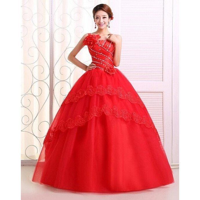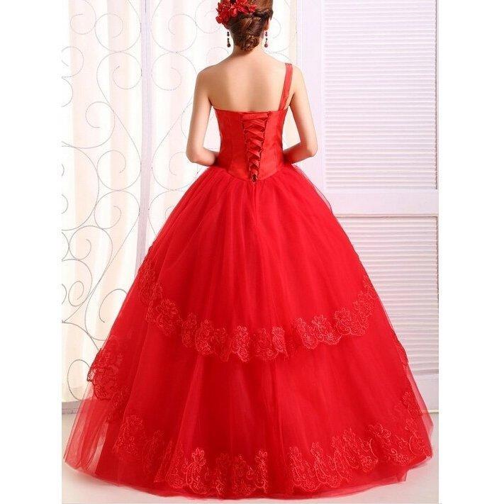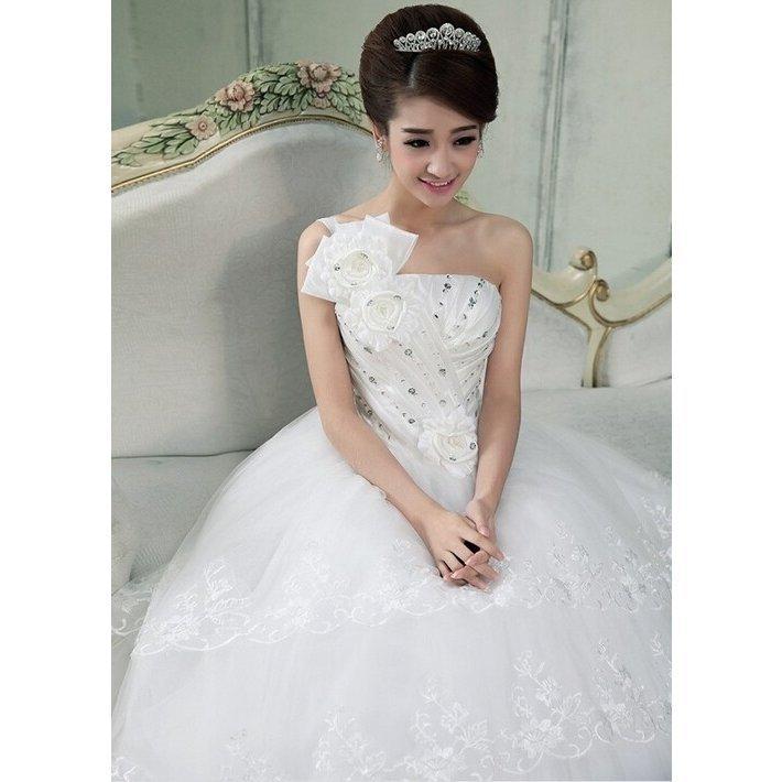 !刺繍シンプルウェディングドレス 豪華なシングル肩ウェディングドレス☆格安結婚式二次会パーティー披露宴結婚式ドレス