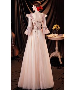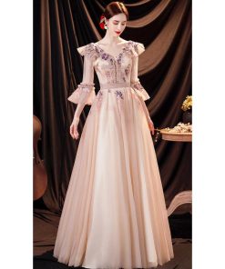 ANGEL Vネック チュール レース パール ビーズ フリル 七分袖付き 背中編上げ Aライン ロングドレス ピンク ロング ドレス パーティードレ