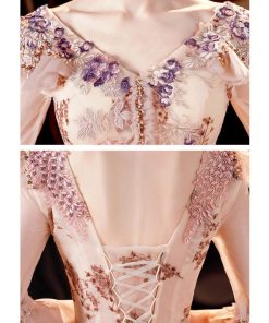 七分袖にチュール・パール・ビーズ・レース・フリル・背中編上げが豪華なAラインロングドレスです♪ファスナーは付いておりませんので背中の編み上げで調整するお手伝いが必要なタイプです。