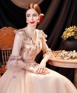 ANGEL Vネック チュール レース パール ビーズ フリル 七分袖付き 背中編上げ Aライン ロングドレス ピンク ロング ドレス パーティードレ