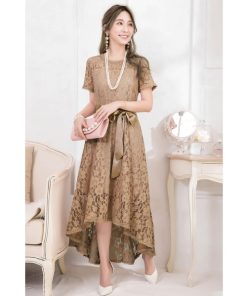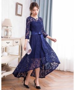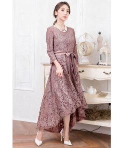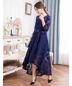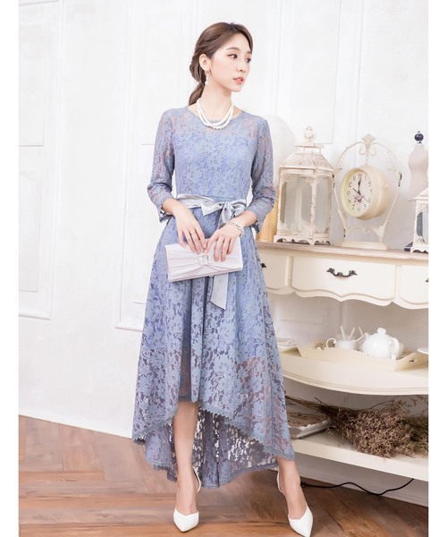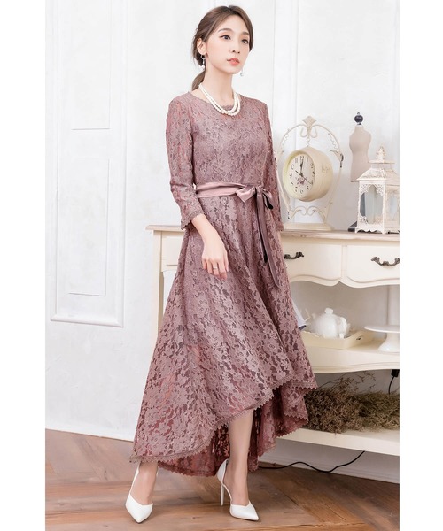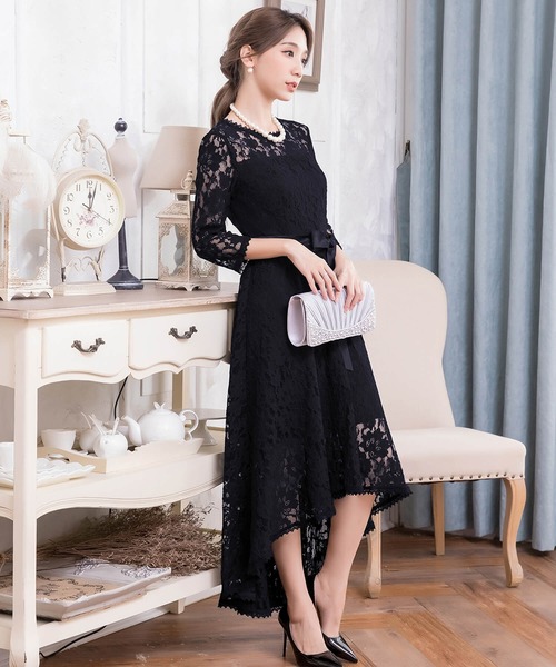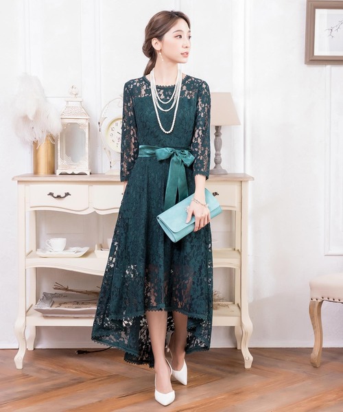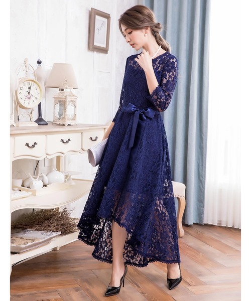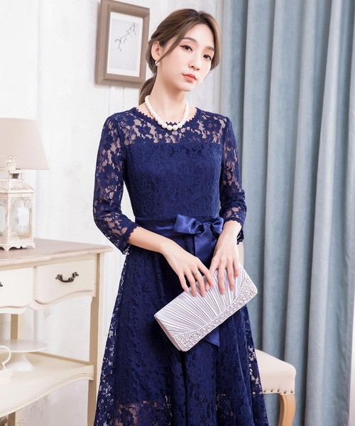 キーワード:ドレス フレア ミモレ丈 リボン レース 長袖 無地
