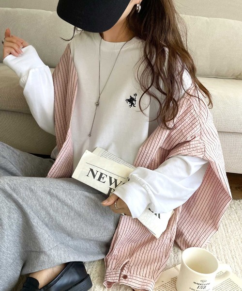 classicalelf tシャツ 後ろ姿も、抜かりなく。胸刺繍 シルケット素材 ゆったりシルエット レイヤード バックヘンリー 長袖 ロンTEE レディース