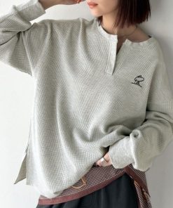 classicalelf tシャツ 洒落感アップのこなれT。胸刺繍ワッフルオーバーサイズキーネックロンT(長袖) レディース