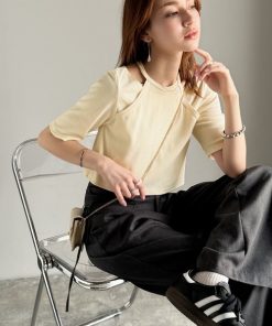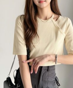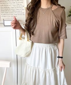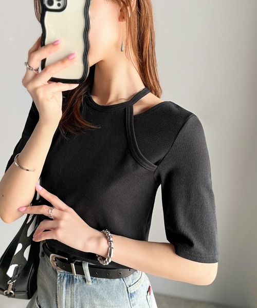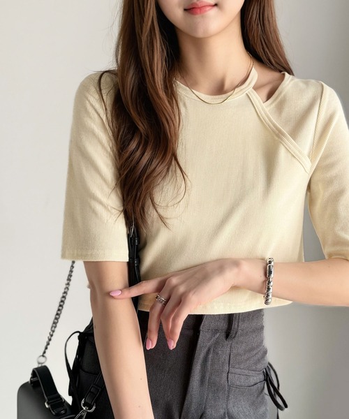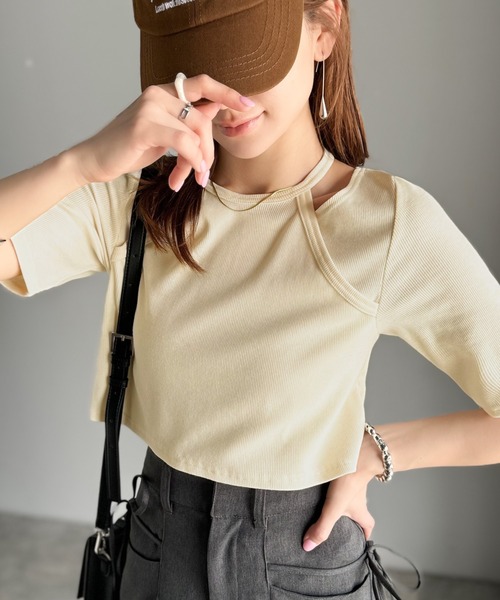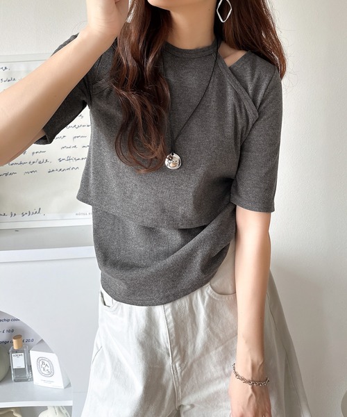 商品名:鎖骨に視線全集中。ヘルシー美人は首元から。鎖骨魅せレイヤード風半袖トップス