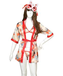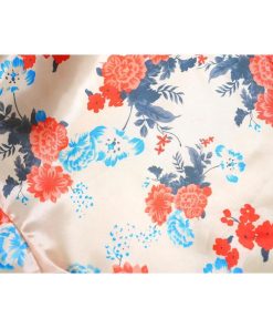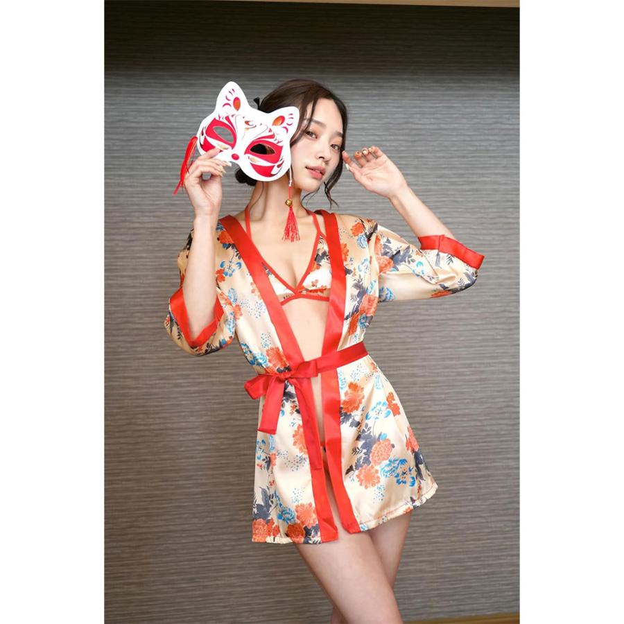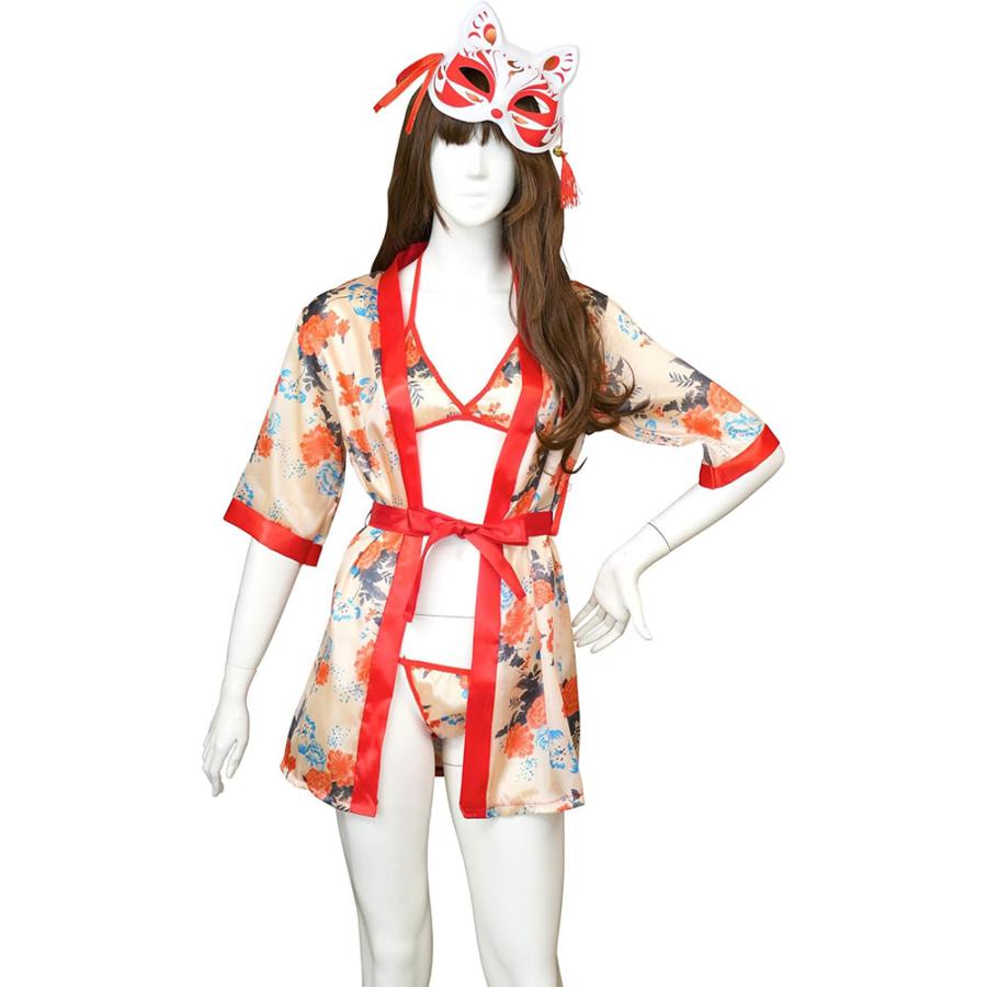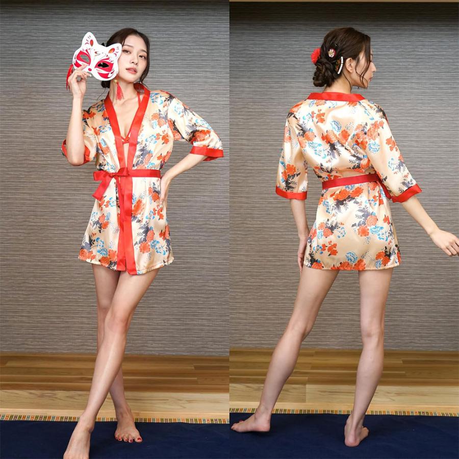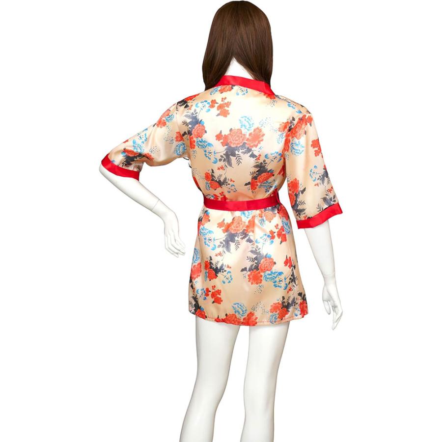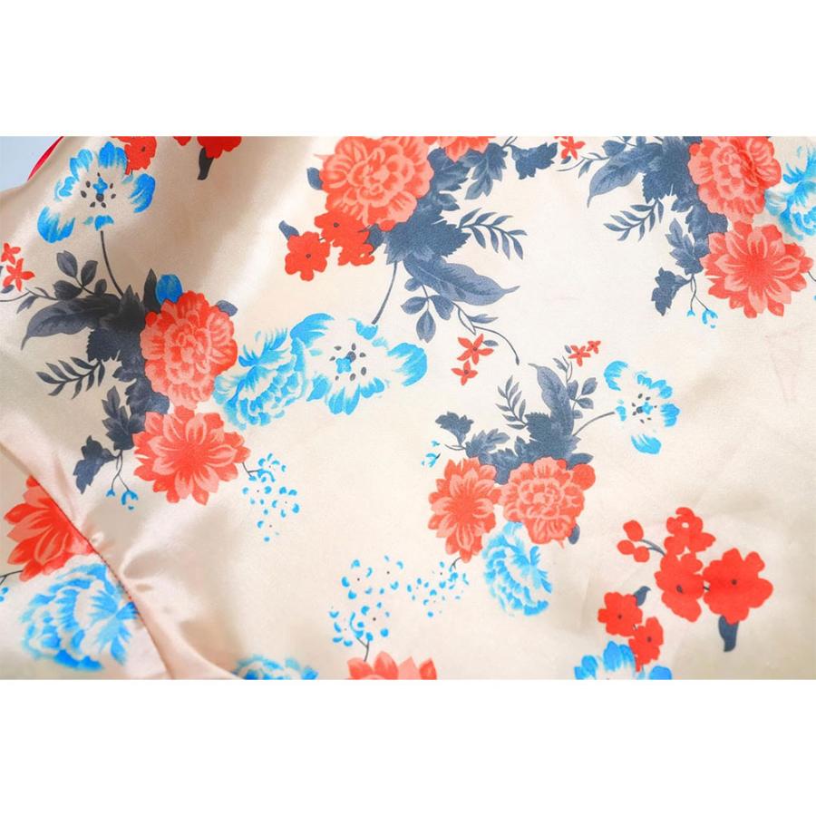 フリーサイズの着物には和風の花柄をプリントしたサテン生地を使用。
