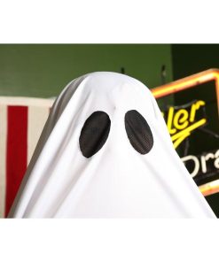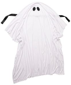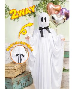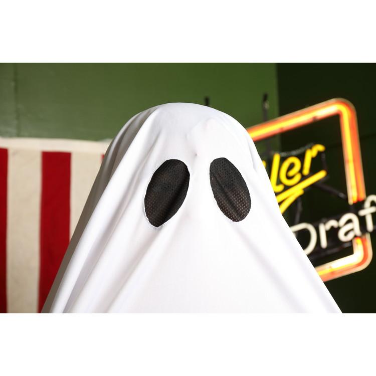 シーツを被ったお化けをイメージしたコスチューム。脇は縫われているので袖のように手を通せます。また目のメッシュ部分から外界を見ることができます。背中のリボンを前で結ぶとてるてる坊主のようにもなれる2WAY仕様。