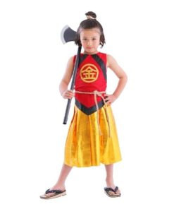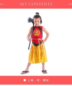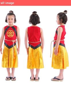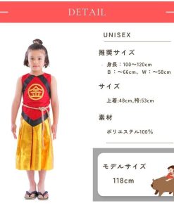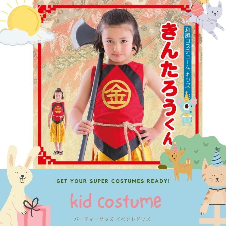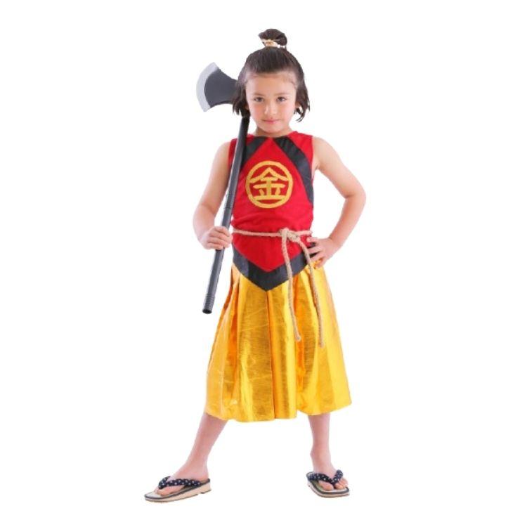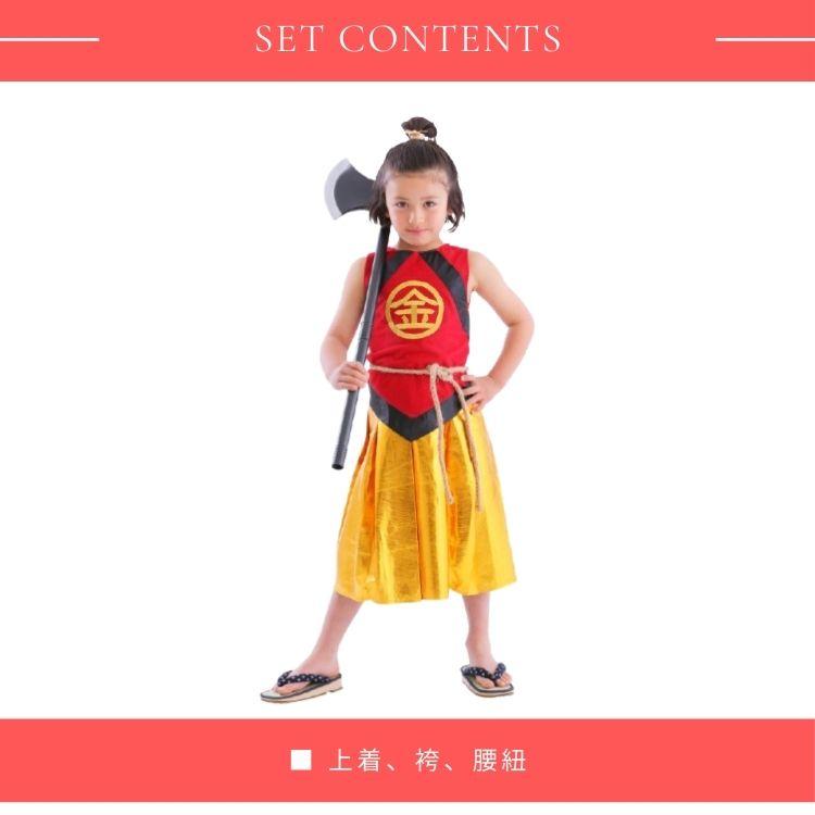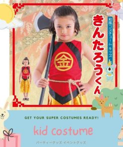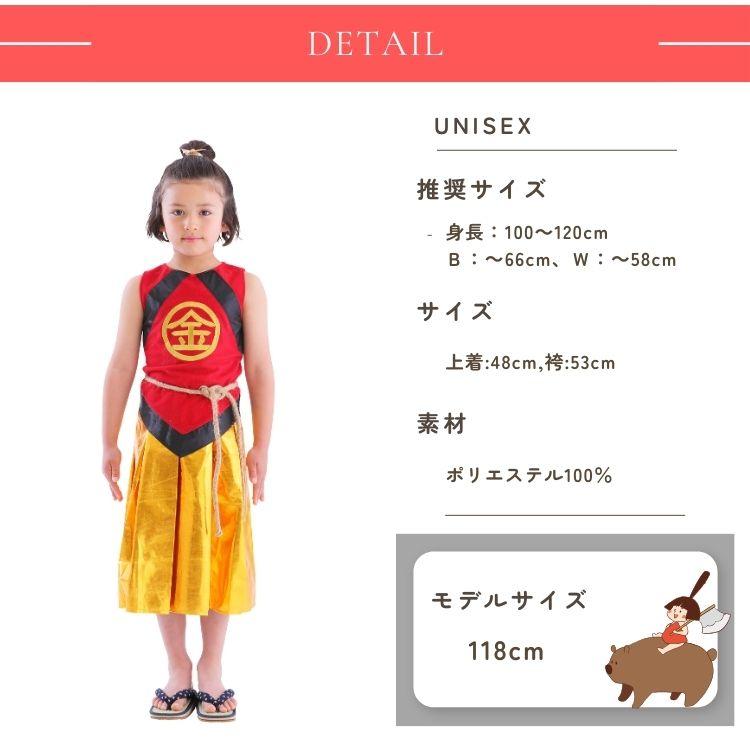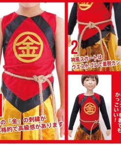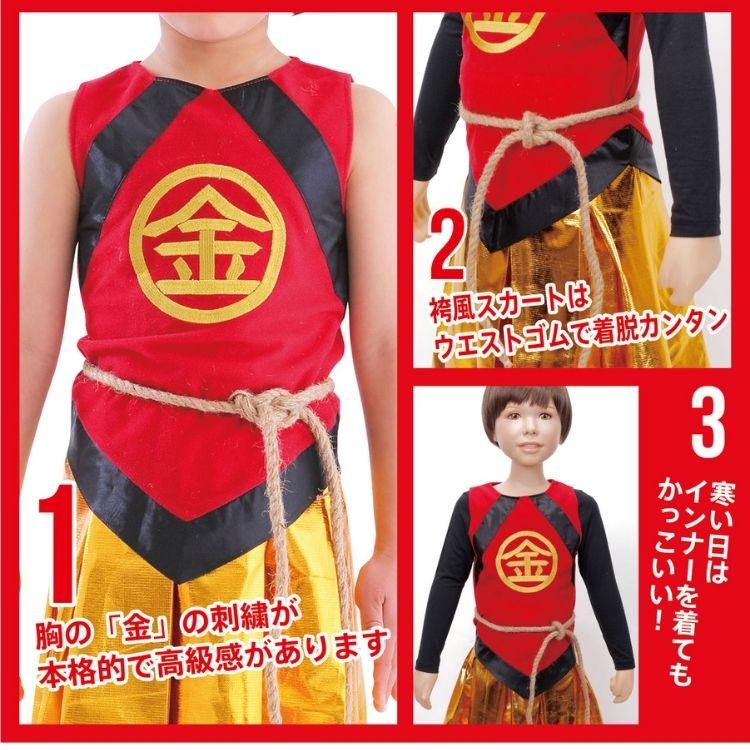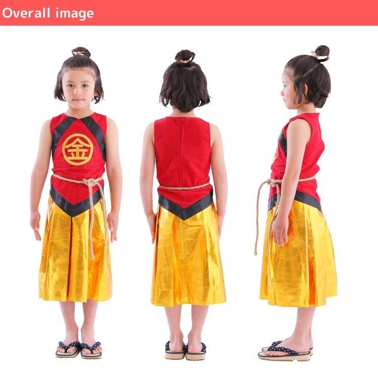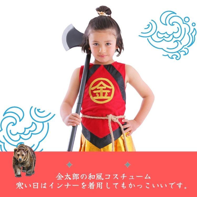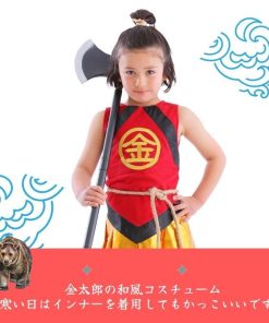 ありそうでなかった金太郎のコスチューム!胸の’金’の刺繍が本格的で高級感があります。袴風スカートはウエストゴムで着脱簡単。寒い日はインナーを着用し、ベスト風に着てもかっこいいです。
