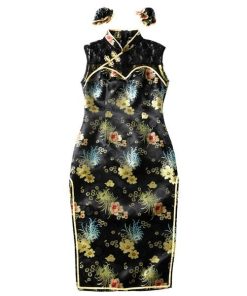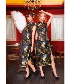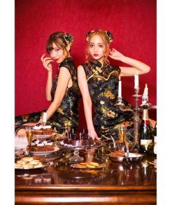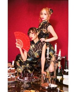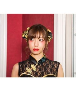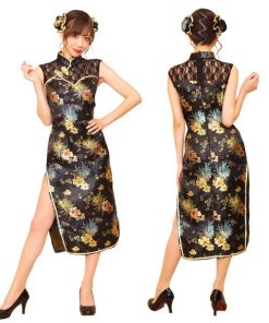 スタイルアップやSNS映えを叶えてくれる、女の子がキラキラ輝けるコスチュームブランド「グロウホリック」。デコルテのレース切り替えがエレガントなロング丈のチャイナコスチューム。自撮り映えするお団子カバーはヘアピンループ付きでショートへアでも着用頂けます。黒がベースのクールなチャイナ生地にゴールドのパイピングがポイント。両サイドにはスリット入りで足を綺麗に見せてくれます。