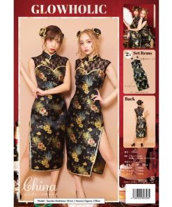 スタイルアップやSNS映えを叶えてくれる、女の子がキラキラ輝けるコスチュームブランド「グロウホリック」。デコルテのレース切り替えがエレガントなロング丈のチャイナコスチューム。自撮り映えするお団子カバーはヘアピンループ付きでショートへアでも着用頂けます。黒がベースのクールなチャイナ生地にゴールドのパイピングがポイント。両サイドにはスリット入りで足を綺麗に見せてくれます。