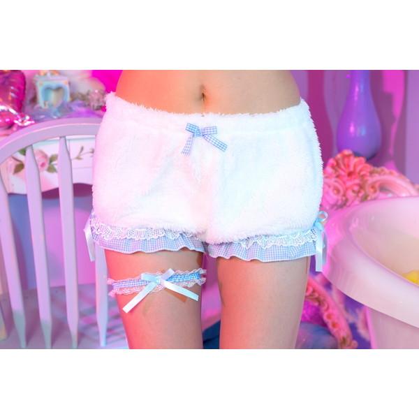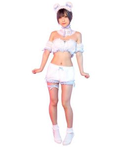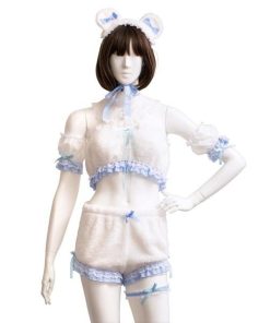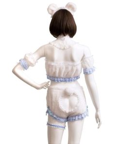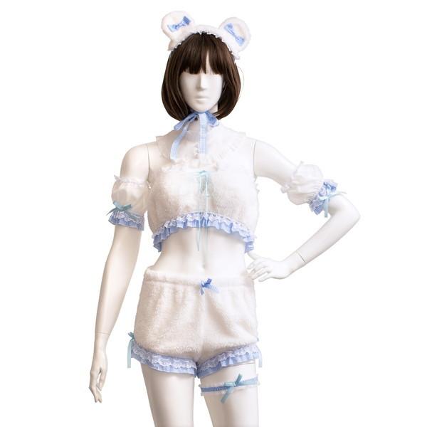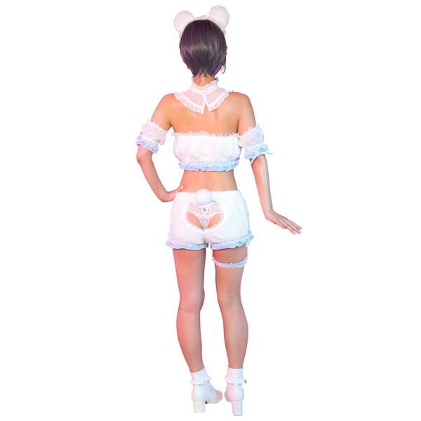 「かわいい×フェティッシュ」がコンセプトの「SugarWhip」シリーズ。撮影会にもおすすめです。小物までこだわった6点セット。バブみたっぷりでヒップのハート開きがポイントなしろくま衣装。ドールのようなくま耳付きヘッドドレスは顎下or首の後ろでリボンで固定できます。スタイのような付け襟はシフォン素材。ブラジャーの中心はハートの窓がポイント。付け袖は透け感のあるシフォン素材です。パンツはプードルファーで、チェックリボン付き。お尻はハート型の窓があり、インナーショーツのコーディネートが楽しめます。ガーターリングにもリボンがついていて、とことんキュートな仕上がりです。