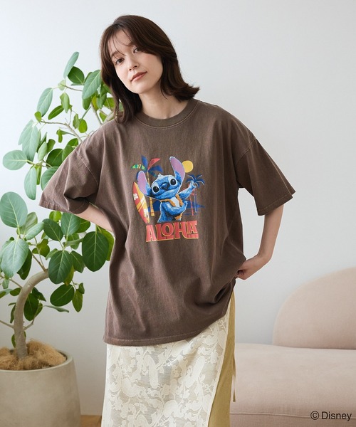 Disney tシャツ スティッチ/ヴィンテージ風ピグメントTシャツ レディース