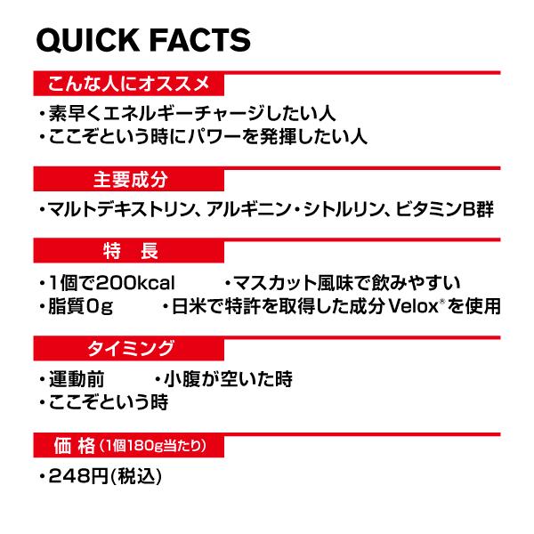 ●「エナジーゼリー」は、短い時間で高いエネルギーが確保でき、かつ、人間の様々なパフォーマンスをサポートする成分が配合されている。何かを成し遂げるなら、エナジーゼリーで、エネルギーを補給しろ。