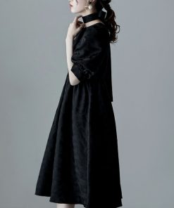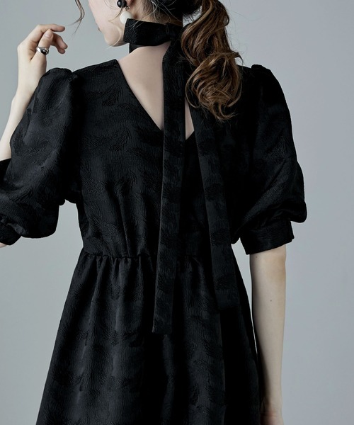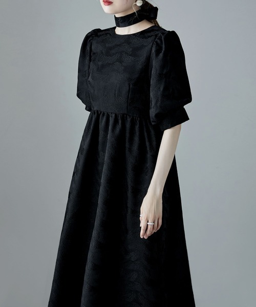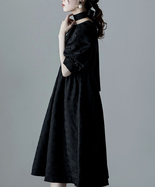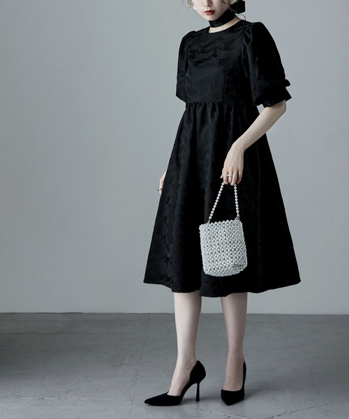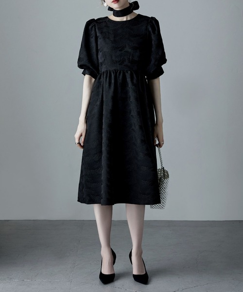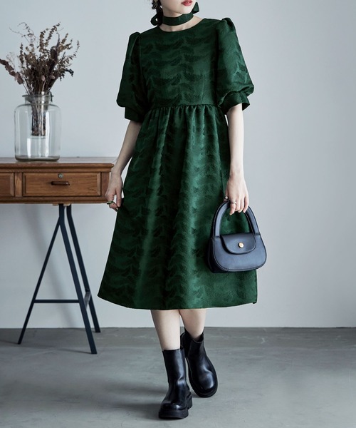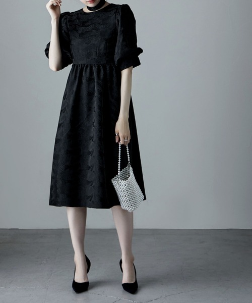 キーワード:ドレス フレア 花柄 七分袖 五分袖 膝丈 ヴィンテージ モード 結婚式二次会 春 大人カジュアル