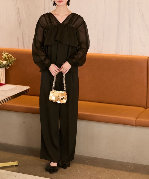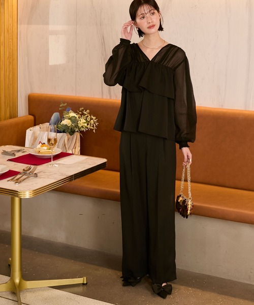 forksy. パンツドレス 「forksy.」「オケージョン対応」シアードッキング フリルブラウス & ワイドパンツ セットアップ