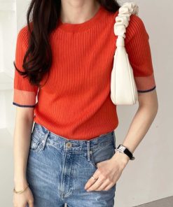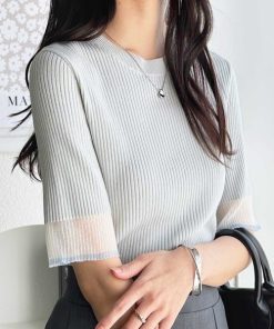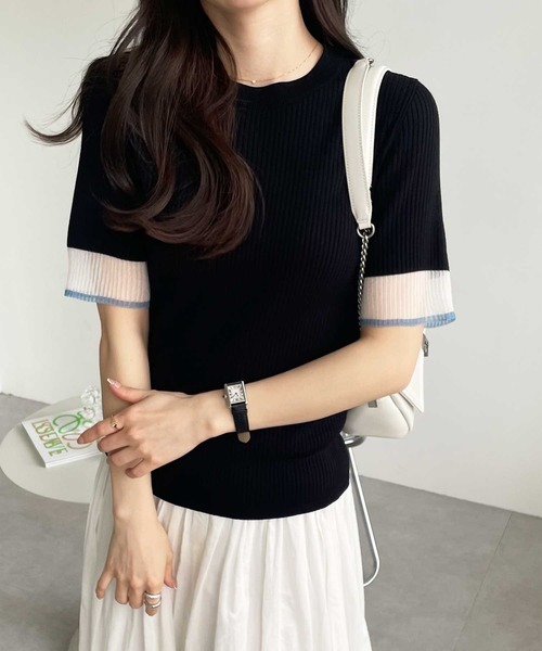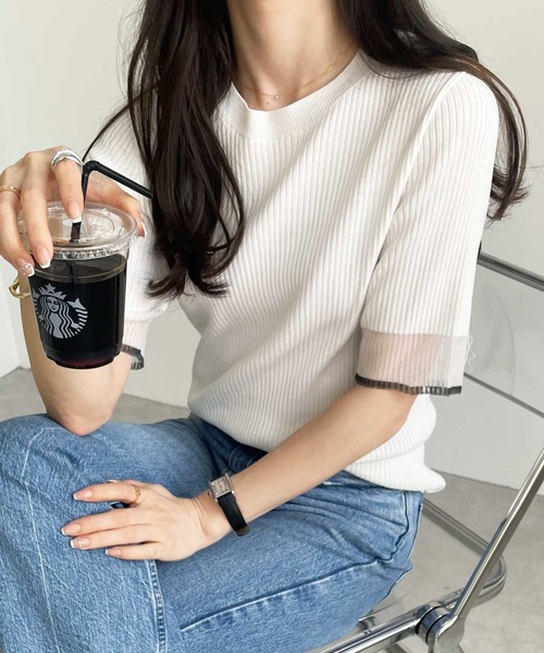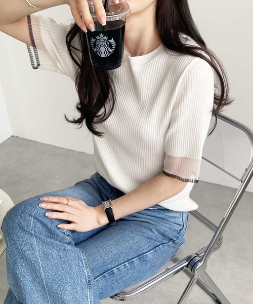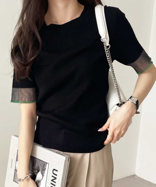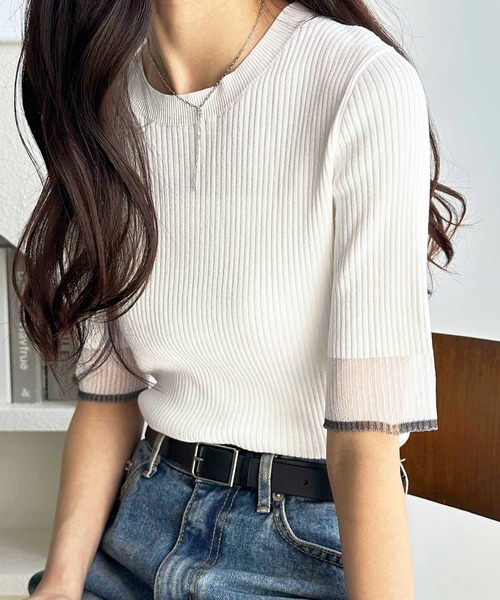 商品名:【S-XLサイズ展開】オフィスカジュアルにもキレカジにも!袖口配色シアーリブニットトップス