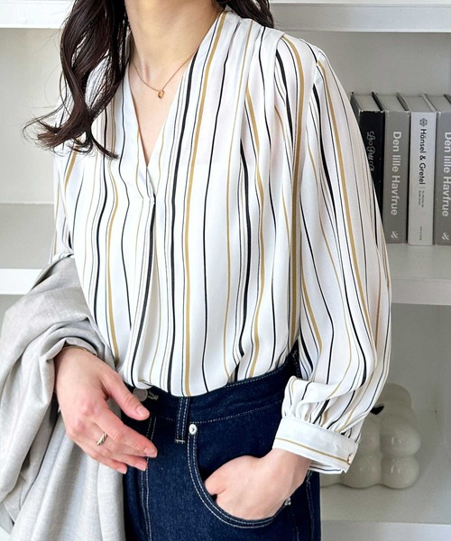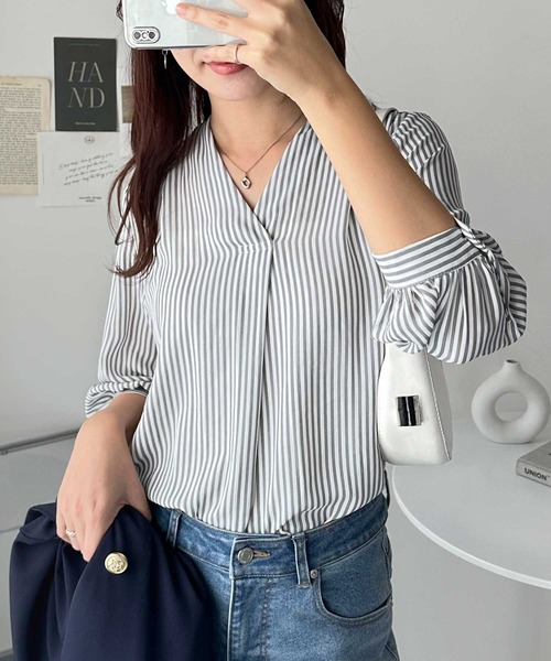 キーワード:ブラウス シャツ レディース ストライプ 七分袖 五分袖 無地 WEB限定 大人カジュアル