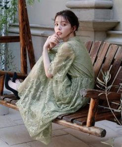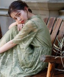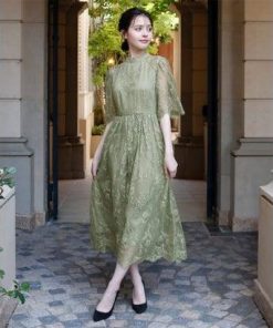 GIRL DRESS FOR NOW ガール ハイネック5分袖総レースミモレ丈結婚式パーティードレス (ライトグリーン)