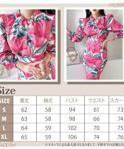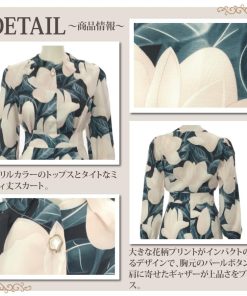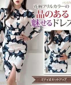 花柄フリルカラーミディ丈セットアップ(キャバドレス・CABARETDRESS)。大きな花柄プリントがインパクトのあるデザインで、胸元のパールボタンや肩に寄せたギャザーが上品さをプラス。フリルカラーのトップスとタイトなミディ丈スカートが大人の余裕を感じ、ビビッドとニュアンスの対照的な2色のカラー展開でそれぞれ表情をガラリと変えます。