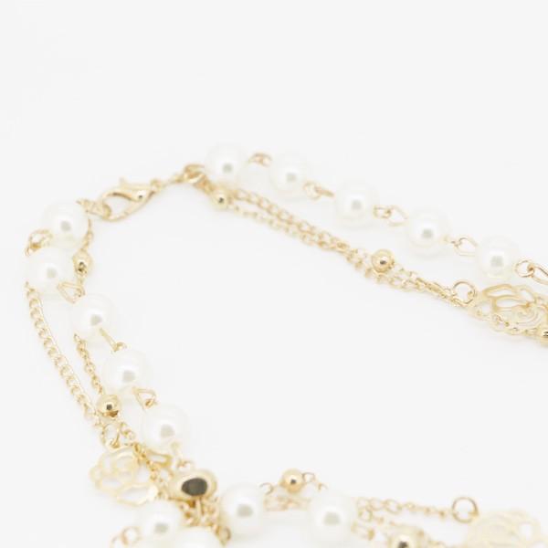 存在感たっぷりの3連パール&ローズパーツネックレス。パーティ使いはもちろん、シンプルスタイルのポイントとしても使えます。